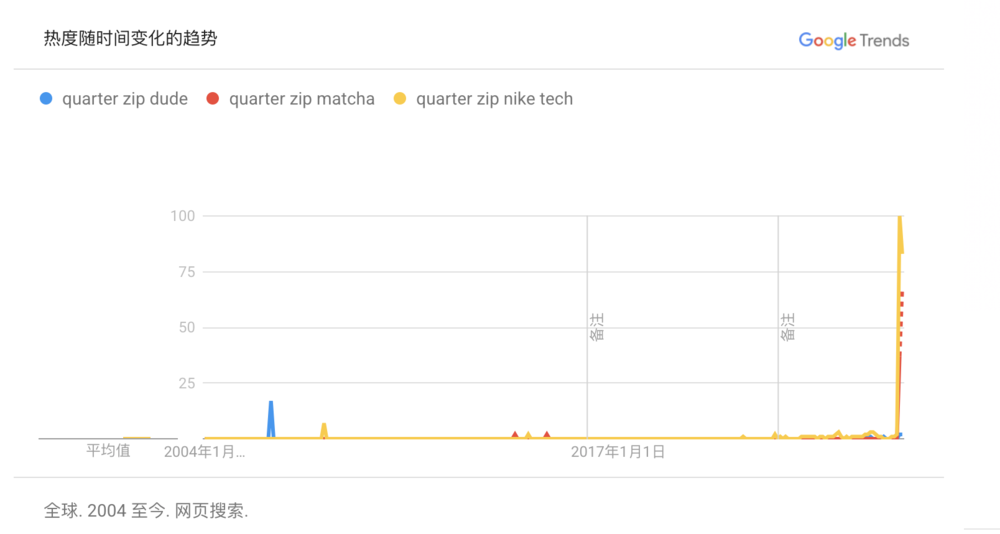 有数据显示,自2024年中期以来,18至24岁人群购买四分之一拉链服饰的销量,同比增长了约25%。与此同时,Google趋势数据表明,在过去12个月内,相关服饰的搜索量增长了约2250%。