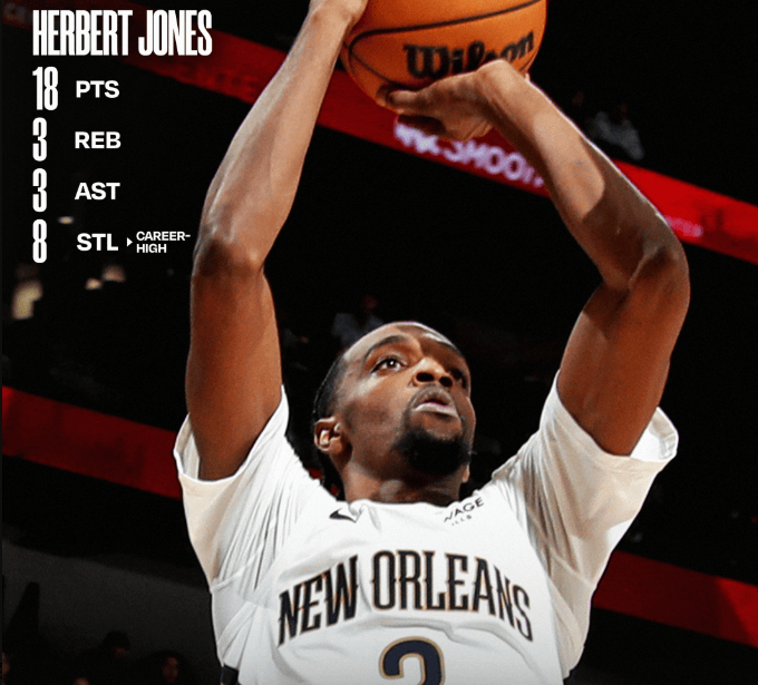 本场比赛,鹈鹕球员赫伯特-琼斯出战38分钟,14投7中,其中三分球6投2中,罚球2投2中,得到18分3篮板3助攻8抢断1封盖。
