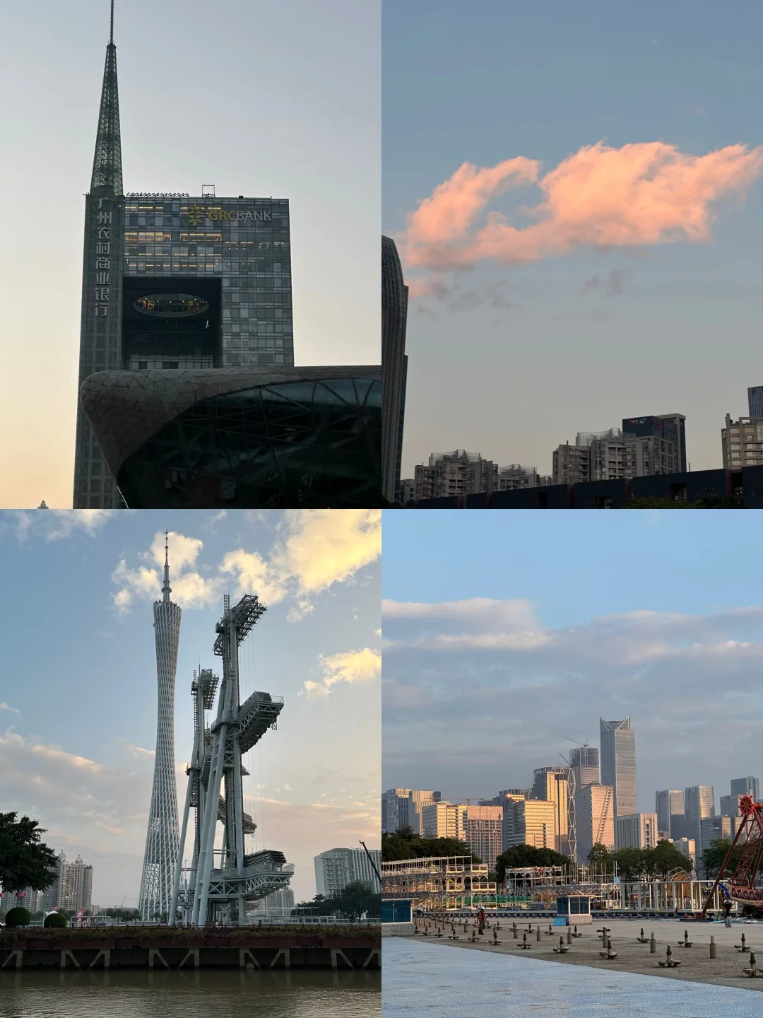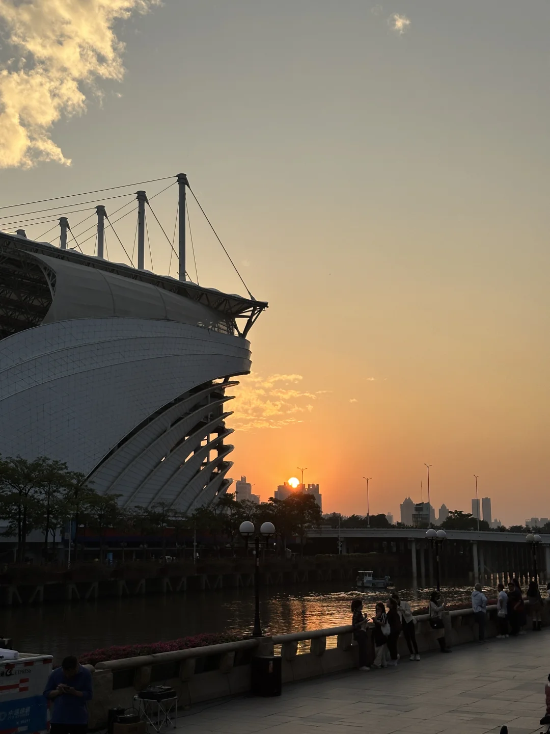 骑着电动穿过海心沙,傍晚的广州塔格外好看,夕阳把塔身染成橘色,和珠江的倒影交相辉映。在江边遇到一位外国小姐姐,她坐在长椅上唱英文歌,歌声温柔又治愈,周围围了好多人静静聆听。