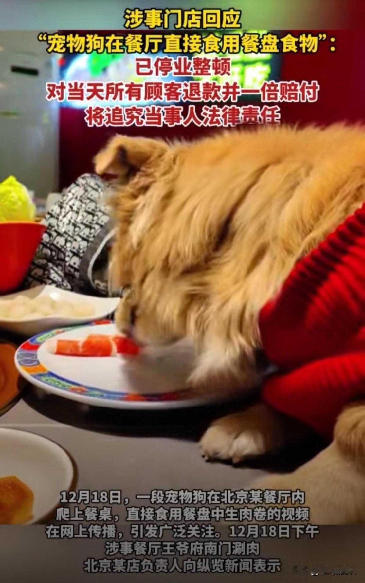 “恃宠而骄”。 涮肉店惊现“旺财”舔净盘底的“光盘行动”,“以一己之欢,扰众人之恶”。 近日,京城一家涮肉店惊现 “人狗同席,其乐融融”的画面。 狗主人不仅让爱犬登堂入室,还踞于餐桌之上,舔光了盘内的生羊肉卷。 店员虽当场劝阻、封存餐具并全面消杀,但餐厅仍难逃停业整顿的后果,还得给当日食客退款加一倍赔付,躺着中枪。 目前店家已报警追责。 爱宠有道,在家把宠物当家人无可厚非,但公共场所总得守规矩。 现在很多宠物主人已然模糊了“宠爱”与“放肆”的界限。将私人领域的亲密无间,肆意扩张至公共场所。 所谓“过犹不及”,对宠物的爱一旦越界, 这份温情便会沦为对他人的冒犯和对公序良俗的挑战。 别让“爱宠”变成“碍人”, 文明的边界可容不得如此肆意践踏。