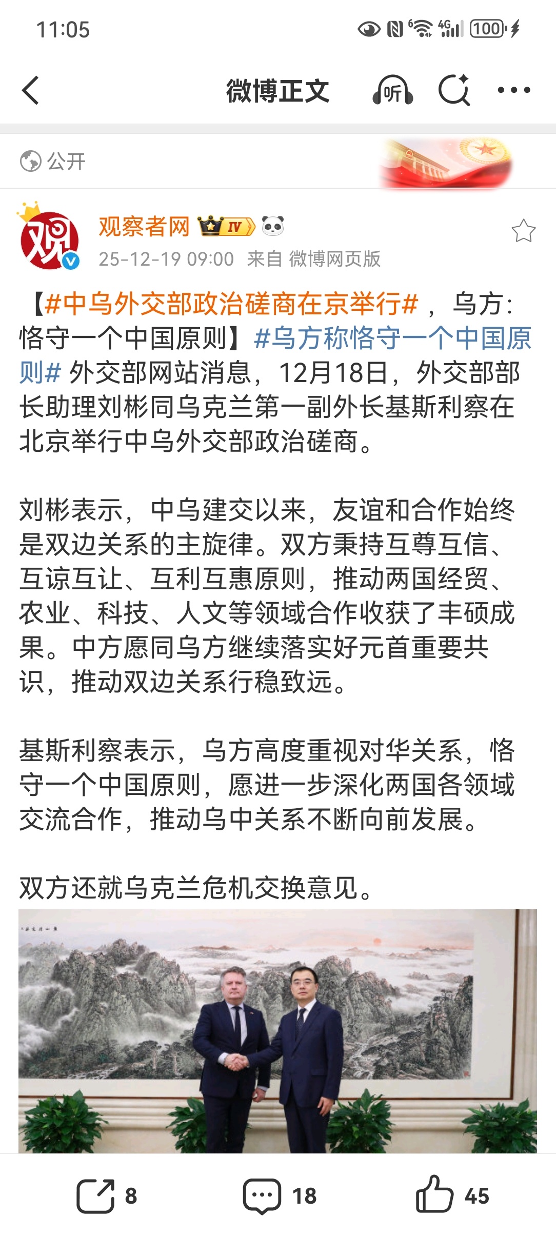 【中乌外交部政治磋商在京举行 ,乌方:恪守一个中国原则】乌方称恪守一个中国原则那些支持侵略战争的“反乌”俄粉们该看看乌克兰官方的态度,不要再因为乌克兰某个议员的幼稚言论,而上升到乌克兰国家层面了。你们有可能是无知,对乌克兰皿煮政治无知;也有可能就是纯纯的无耻,故意以偏概全。全网热点共创计划烽火问鼎计划