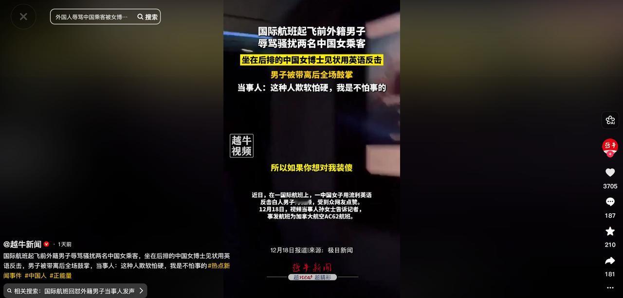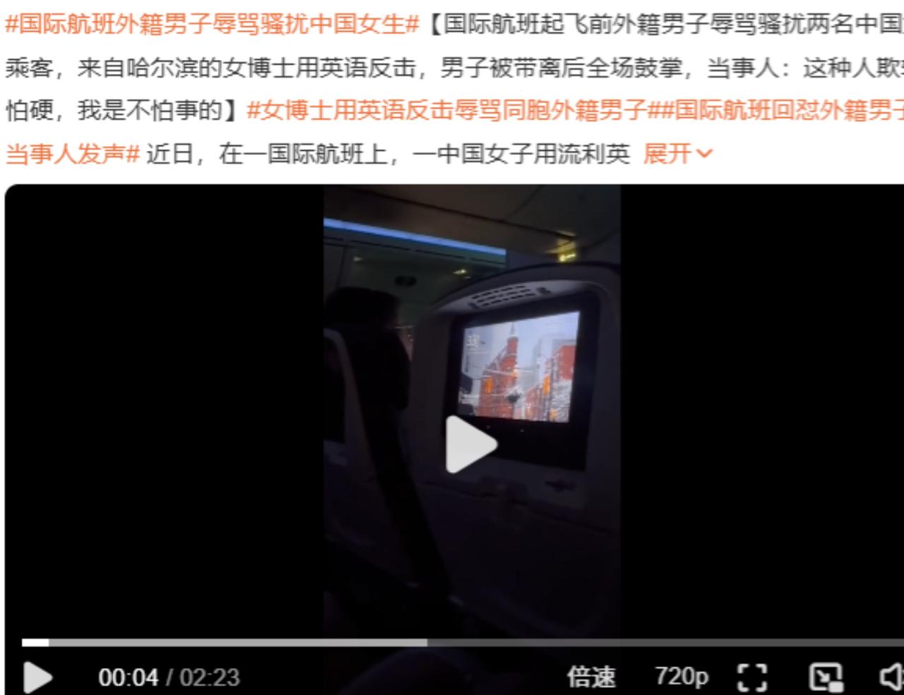 太解气了!在国际航班上,2名中国女生遭外籍男子无端辱骂,女生不想惹事,假装没听见!没想到外籍男子不仅不收敛,反而变本加厉,称她们为“蠢蛋”“哑巴”!并使用其他言语持续骚扰。后座孙女士大声斥责该男子,用流利的英文反击,要求他停止骚扰,结局令人大快人心! 事情发生在飞机滑行准备起飞的时候,机舱里几百名乘客都在安静等待,突然一阵刺耳的骂声打破了平静,发出声音的是一个满身酒气的外籍男子,他的目标是坐在邻座的两名中国女生,这两个姑娘看着年纪不大,估计也是第一次遇到这种情况,一时间有些不知所措。 在外遇到这种无端挑衅,很多人的第一反应都是 “多一事不如少一事”,这两名女生也不例外,她们不想把事情闹大,怕影响行程,更怕惹上不必要的麻烦,于是就选择了沉默,把头低下假装没听见,身体甚至不自觉地缩在座位上,看着就让人心疼,可她们的忍让并没有换来对方的收敛,反而让这个醉汉觉得有机可乘,变得更加变本加厉。 一开始那男子的辱骂还只是含糊不清的嘟囔,可见女生们不反抗,他的胆子越来越大,言语也越来越难听,“蠢蛋”“哑巴” 这类侮辱人的词汇随口就来,还夹杂着不少污言秽语,像脏水一样泼向两名女生。 更过分的是他激动起来的时候,手指都快戳到女生的脸上了,那副嚣张跋扈的样子,仿佛自己做了什么了不起的事,整个机舱里都弥漫着尴尬和压抑的气氛,其他乘客虽然看着不舒服,但大多选择了沉默,毕竟在密闭的飞机上,谁也不想轻易惹麻烦。 就在这让人窒息的时刻,坐在后排的孙女士实在看不下去了,孙女士是哈尔滨人,骨子里带着东北姑娘的豪爽和正义感,她在多伦多附近的城市读博士,不仅语言能力过硬,逻辑思维也特别清晰,看着同胞被人这么欺负,她心里憋着一股气,觉得这时候必须有人站出来制止这种行为。 一开始孙女士还想着给对方留几分情面,她摘下耳机轻声提醒前排的两名女生,如果实在忍受不了,可以叫乘务员来调换座位,可她的话音刚落,那个醉汉就像是被点燃的炮仗,再次爆发了,咆哮声就算是飞机滑行的噪音都盖不住,整个机舱里的人都听得一清二楚。这一次,孙女士没有再犹豫,直接站起身来。 她没有像对方那样歇斯底里地对骂,也没有撒泼打滚,而是用流利又清晰的英语,字正腔圆地开始控场,她的声音极具穿透力,每一句话都掷地有声,明确要求那个外籍男子必须尊重其他乘客,立刻停止辱骂和骚扰,否则就马上叫乘务员来处理。 这突如其来的反击让那个外籍男子明显愣了一下,他大概从来没想过,这些看起来温顺的东方面孔里,竟然有人敢这么直接地跟他硬刚,而且说得有理有据让他无从反驳。 恼羞成怒的醉汉没能在孙女士这里占到便宜,竟然把怒火转移到了闻声赶来的乘务员身上,对着乘务员也一顿乱喷,言语更加恶劣,这一下性质就变了,不再是简单的私人恩怨,而是公然扰乱航空秩序,影响飞行安全。 乘务员本来还想试着安抚调解,可面对这样的辱骂,也只能果断采取措施,为了保证全体乘客的安全,原本已经在滑行的飞机竟然直接调头开回了廊桥。 接下来的结局简直大快人心,地面工作人员很快就上了飞机,直接把这个还在胡搅蛮缠的外籍男子带离了机舱,就在他灰溜溜起身离开的那一刻,机舱里压抑了许久的乘客们不约而同地爆发出了雷鸣般的掌声,大家都在为这个结果欢呼,更在为孙女士的勇敢点赞,谁都明白是孙女士的挺身而出,才赶走了这个破坏秩序的不安全因素,让大家能安心继续行程。 飞机抵达多伦多后,孙女士没有就此作罢,她冷静地把自己全程录下的视频交给了乘务员,作为后续调查的证据,这一连串的操作,简直堪称 “教科书式反击”,既维护了自己和同胞的权益,又做到了有理有据,让人挑不出一点毛病。 后来大家才知道,那个外籍男子在上飞机前就喝了不少酒,纯属酒后撒野,事后有人问孙女士为什么敢站出来,她的回答特别实在:“就是看不惯同胞受欺负,也见不得这种欺软怕硬的人。” 其实这事儿想想真挺让人后怕的,如果不是孙女士及时站出来,那两名女生可能还会继续遭受辱骂,甚至可能引发更严重的冲突。 在异国他乡我们不主动惹事,但也绝对不能怕事,当遇到无端的挑衅和侮辱时,一味地沉默和忍让只会让别人觉得我们好欺负,而像孙女士这样用理智和勇气站出来,不卑不亢地维护自己和同胞的权益,才能真正赢得别人的尊重。 这场发生在高空的 “反击战”,不仅让所有乘客都觉得解气,更给我们上了生动的一课,无论身在何处,正义和勇气永远是我们最有力的后盾,面对无礼的挑衅,该出手时就出手,才能让那些心怀不轨的人知道,中国人不好惹,我们的尊严不容侵犯。