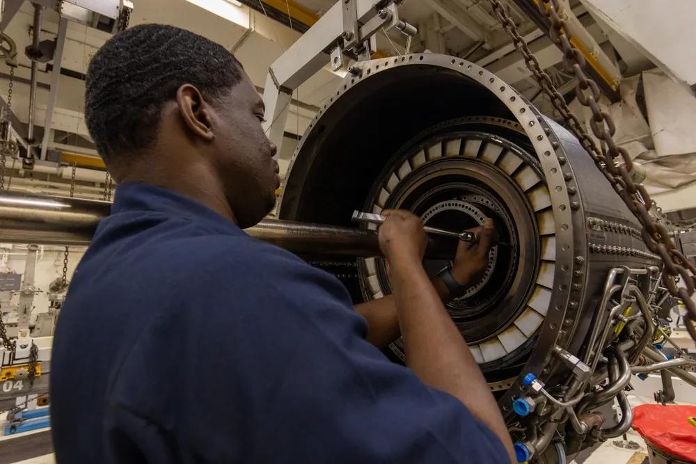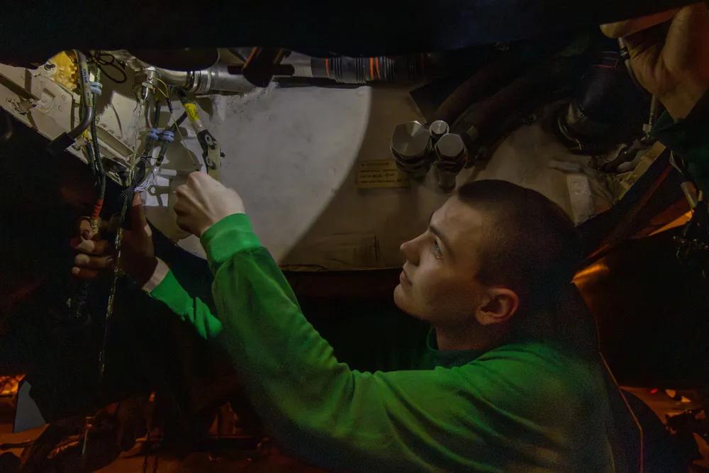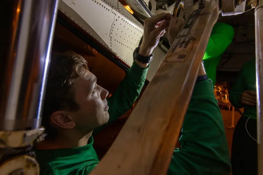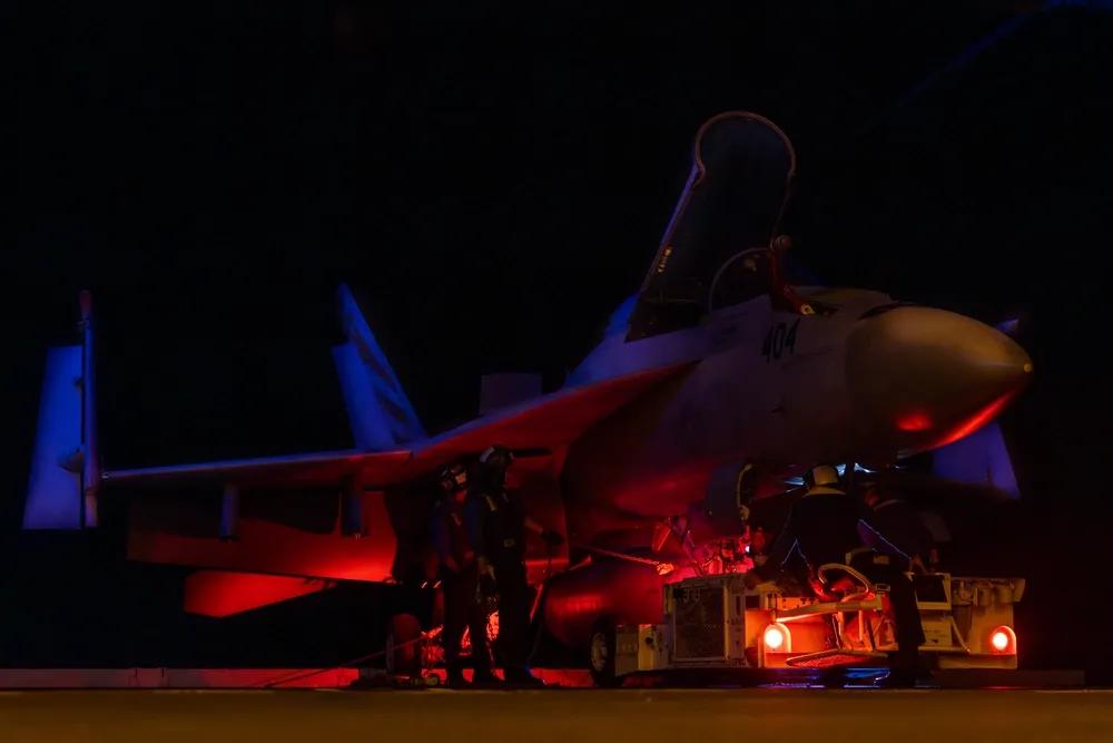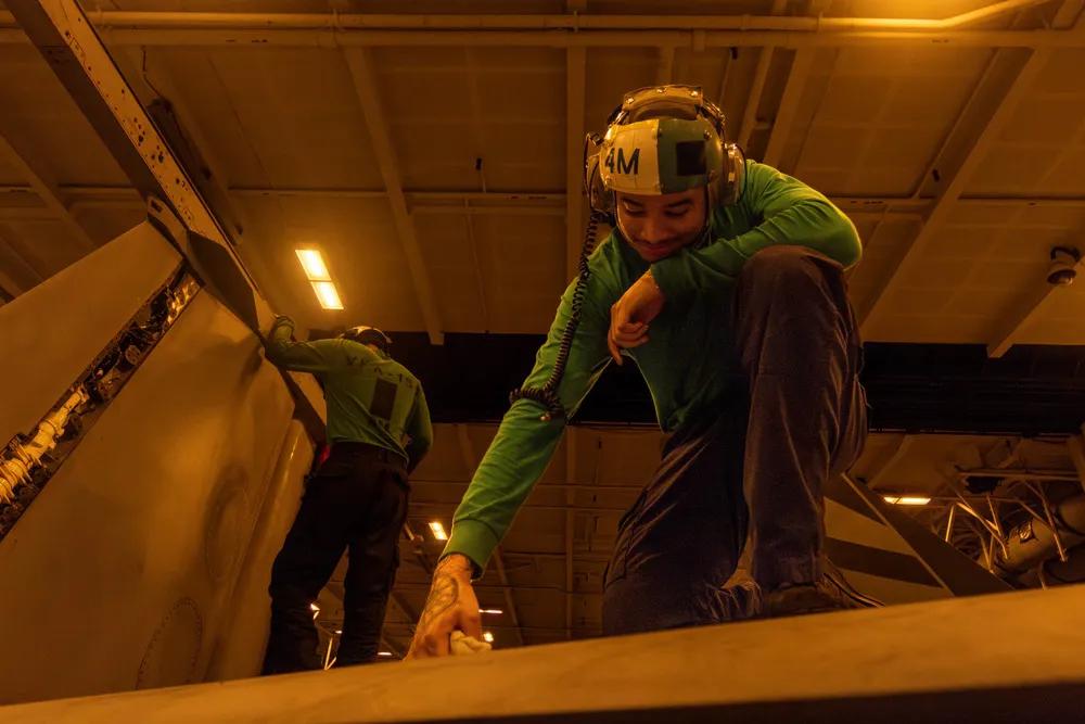 在航空母舰上,技术含量最高的就是维修保障士兵。 2025年12月16日,菲律宾海,在美军尼米兹级航空母舰亚伯拉罕·林肯号(CVN 72)的机库舱内,维修保障人员正在对飞机进行必要的检查。亚伯拉罕·林肯号航母打击群正在美国第七舰队作战区执行例行行动。第七舰队所属单位定期在印太地区巡逻。