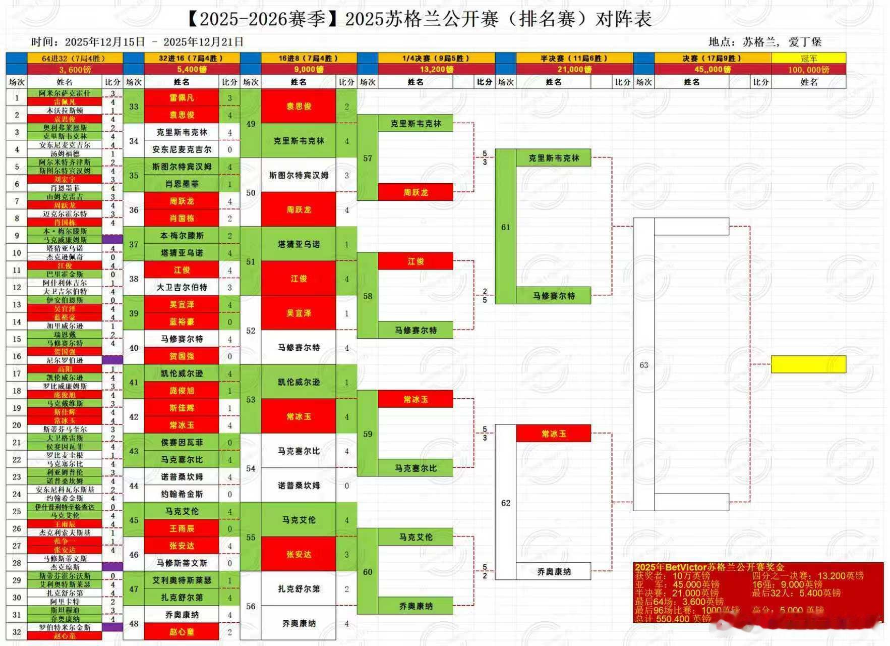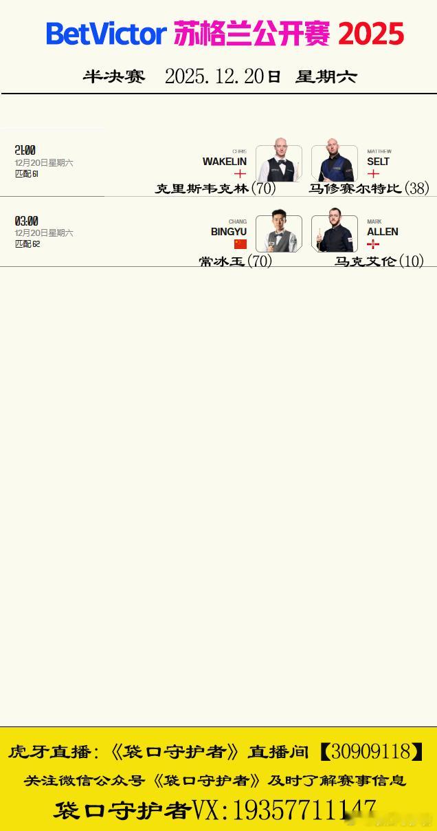 2025苏格兰公开赛第六天、 半决赛(11局6胜)中国选手常冰玉晋级半决赛;2025.12.20日 星期六21:00 直播:马修赛尔特VS克里斯韦克林2025.12.21日 星期日3:00直播:常冰玉VS马克艾伦