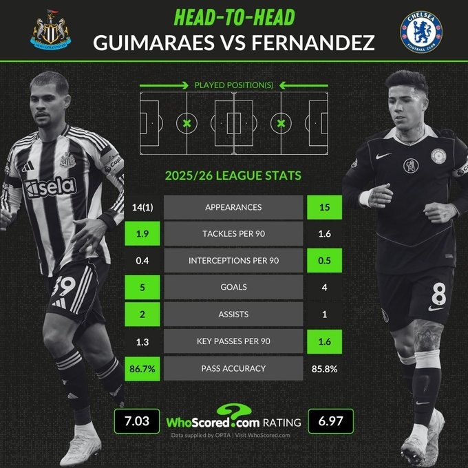 直播吧12月20日讯切尔西即将在英超焦点战客战纽卡,whoscored也对比了两队中场核心本赛季联赛关键数据。
