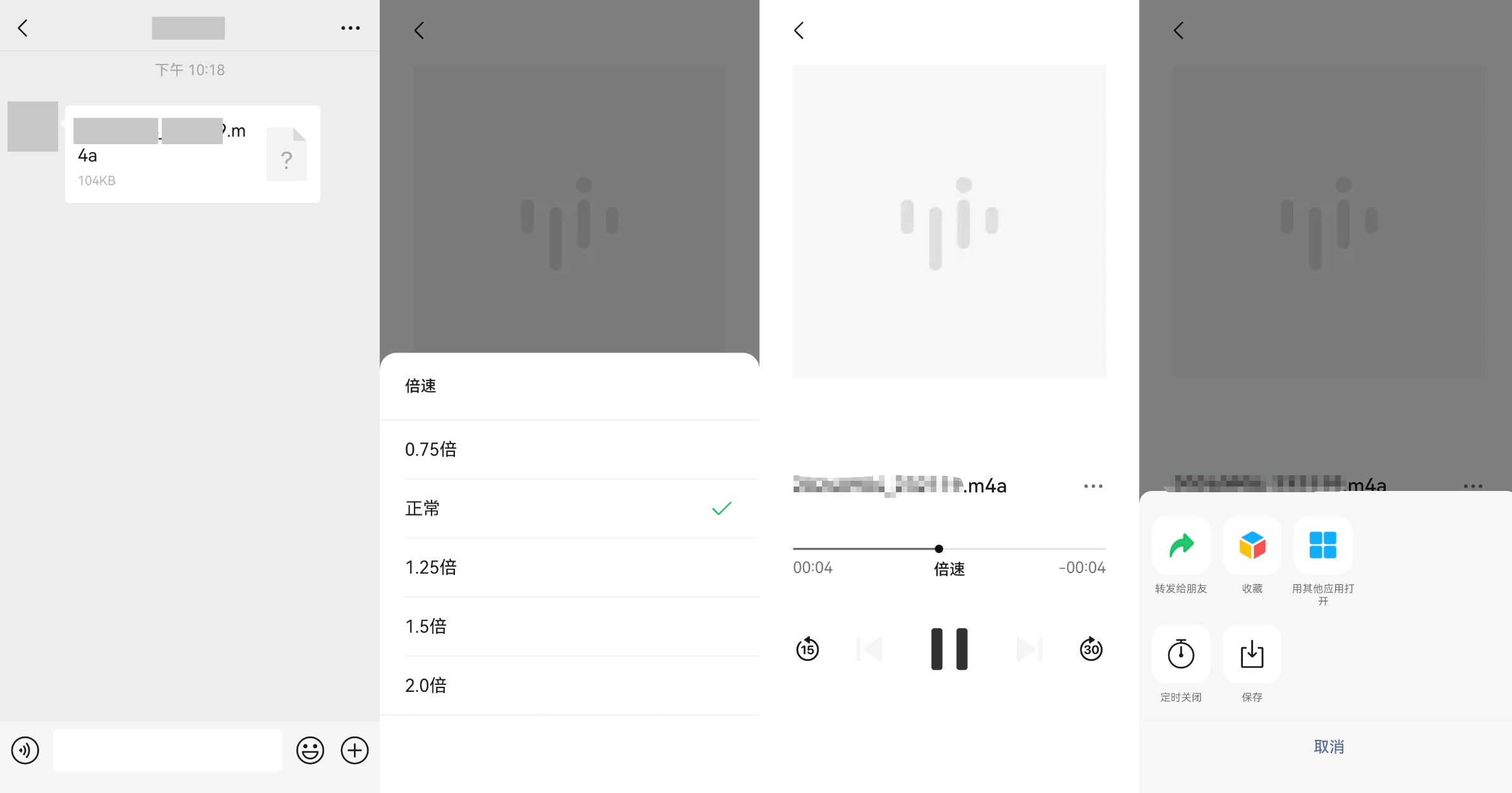 新版本的便利性还延伸到了播放音频的体验上。以前收到客户发的mp3、wav或者m4a格式的录音文件,总是还需要用第三方播放器才能播放,切来切去特别麻烦。现在聊天界面就能直接播放,还能快进、倍速。