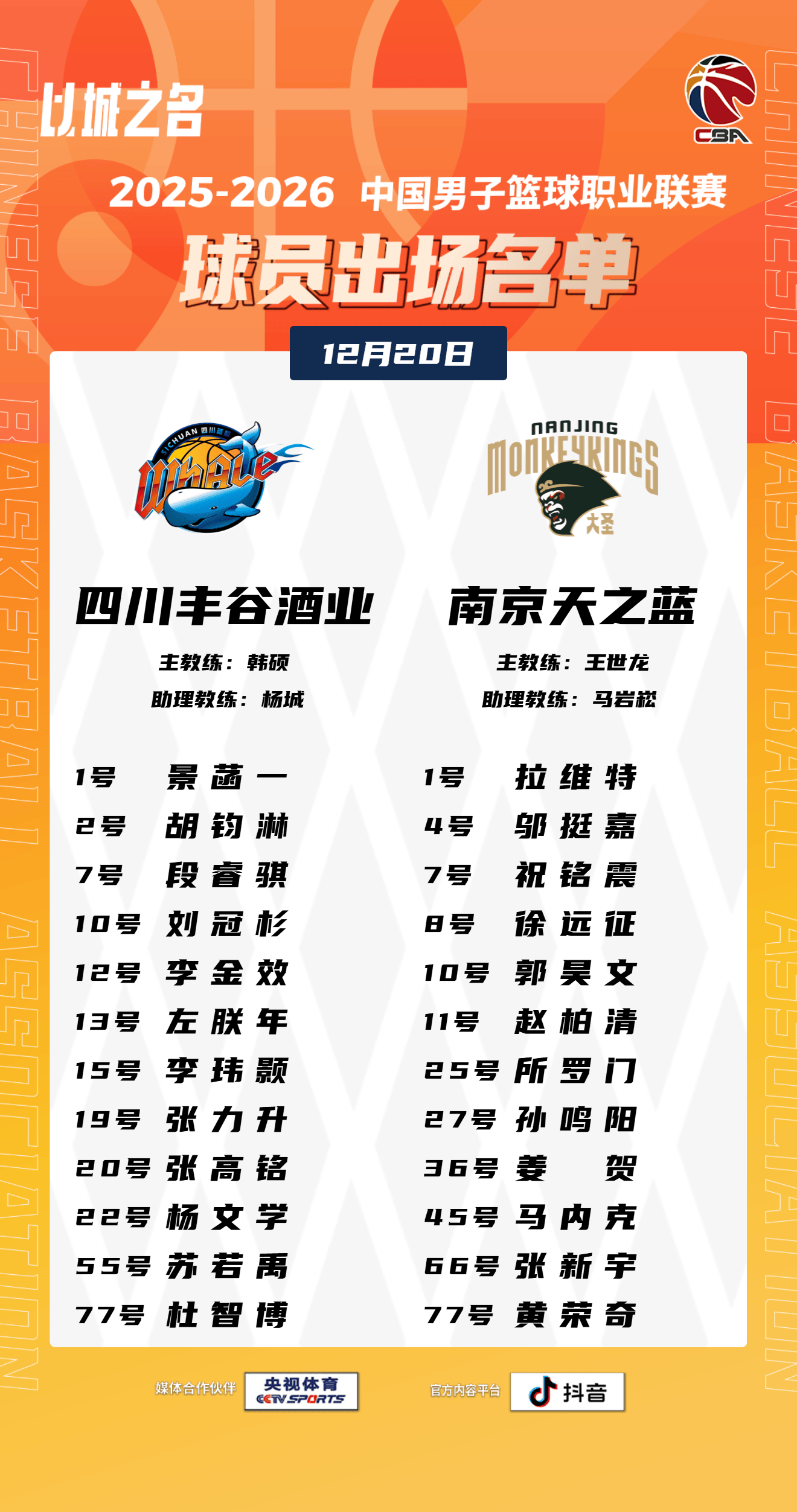 虎扑12月20日讯今日CBA常规赛,四川对阵南京的大名单已经公布。