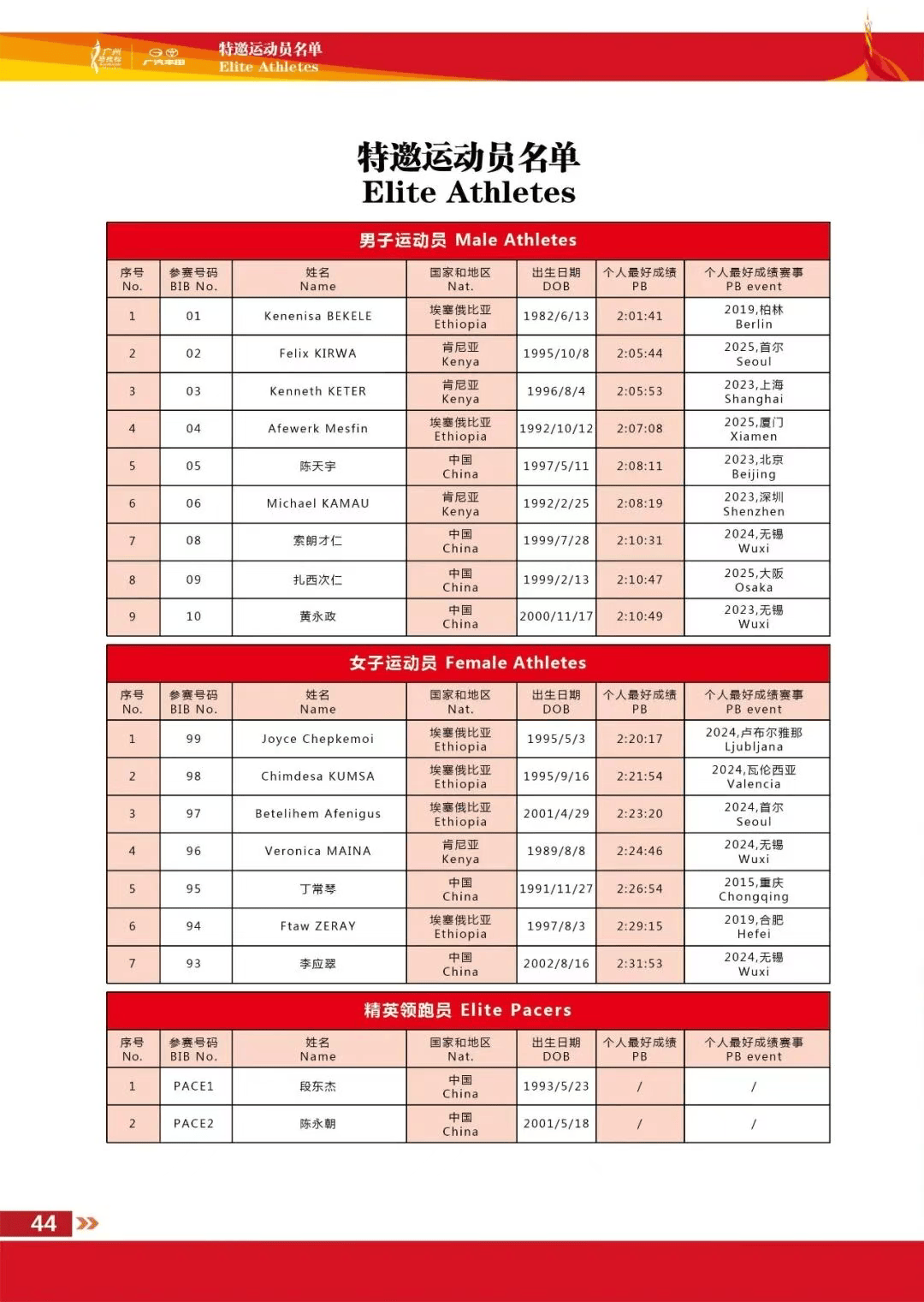 除了贝克勒之外,男子精英选手还包括还有3位PB在208以内的埃塞俄比亚和肯尼亚选手。国内男子特邀选手则包括去年广马冠军陈天宇等人。