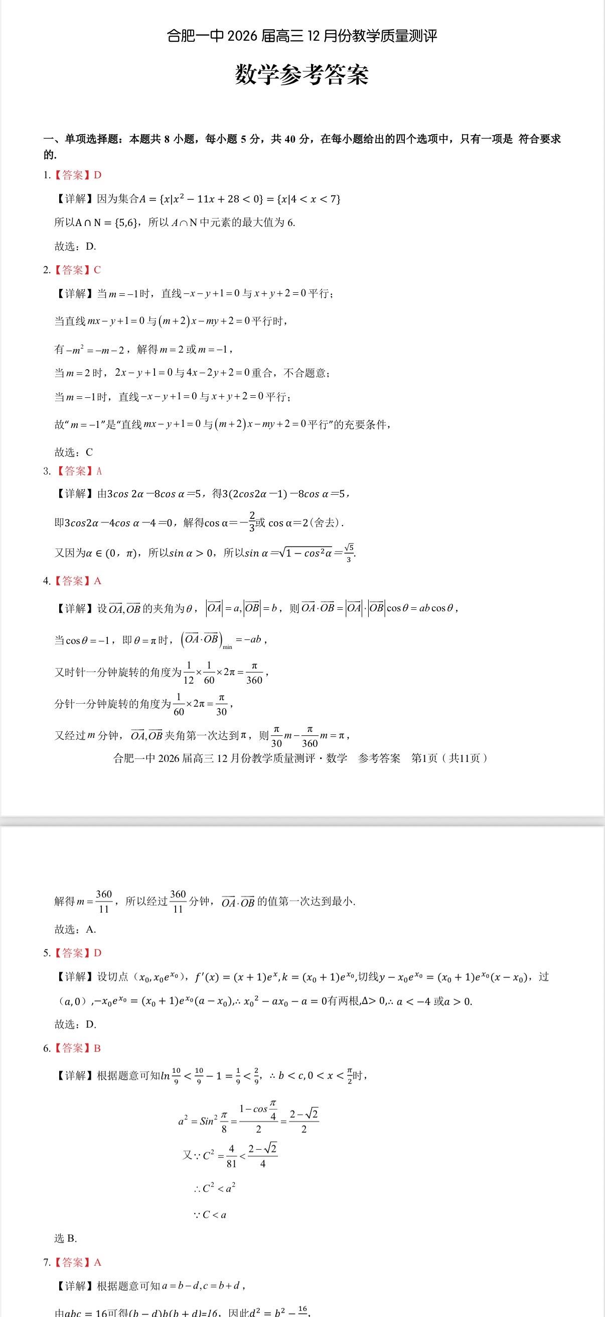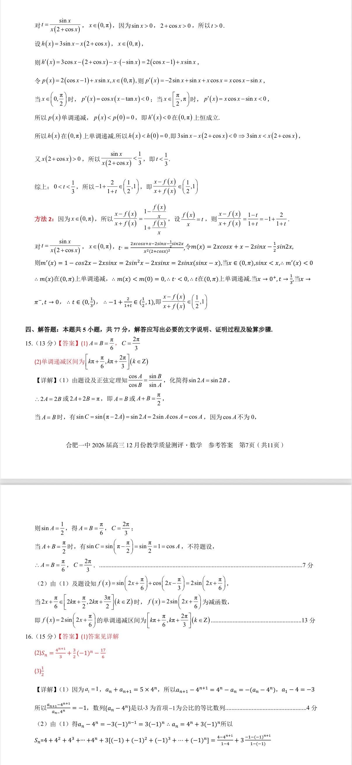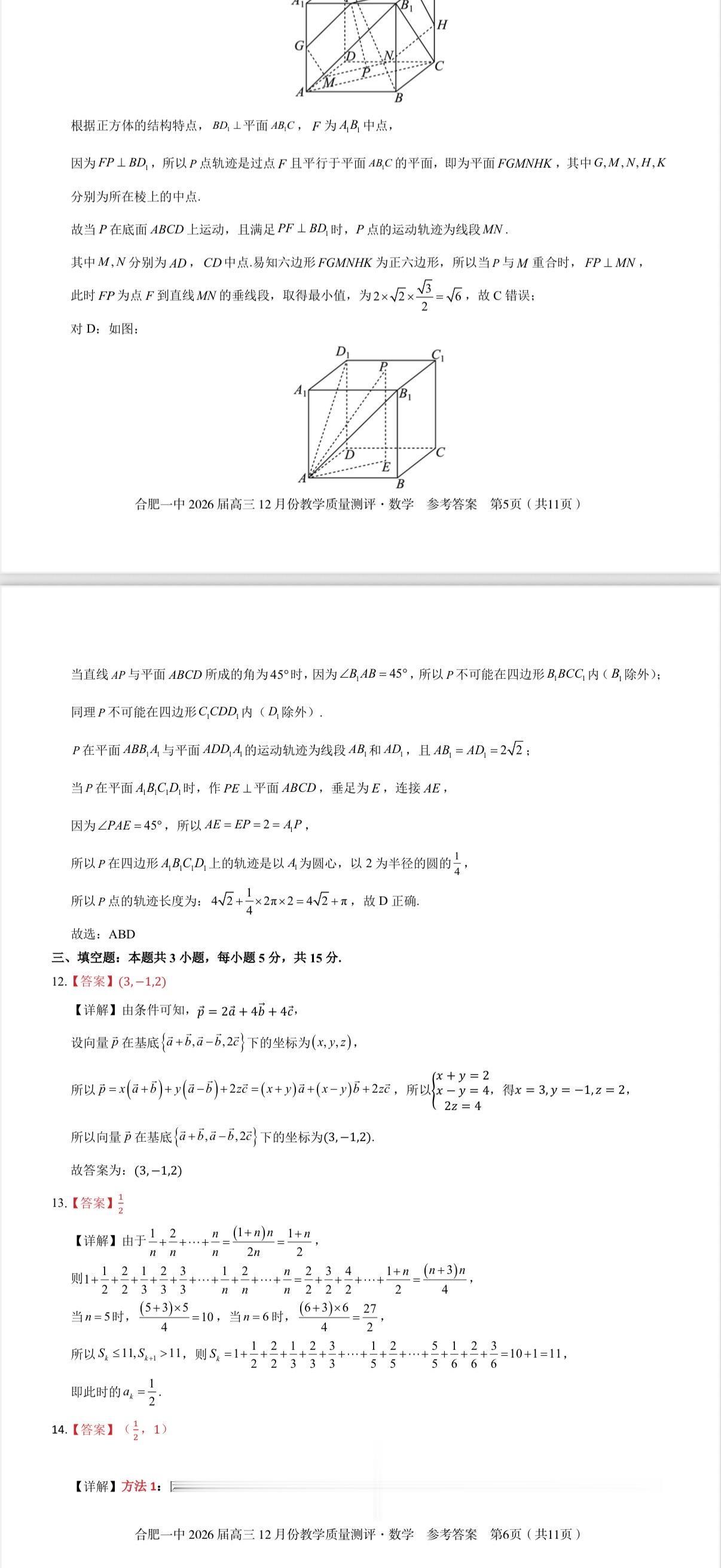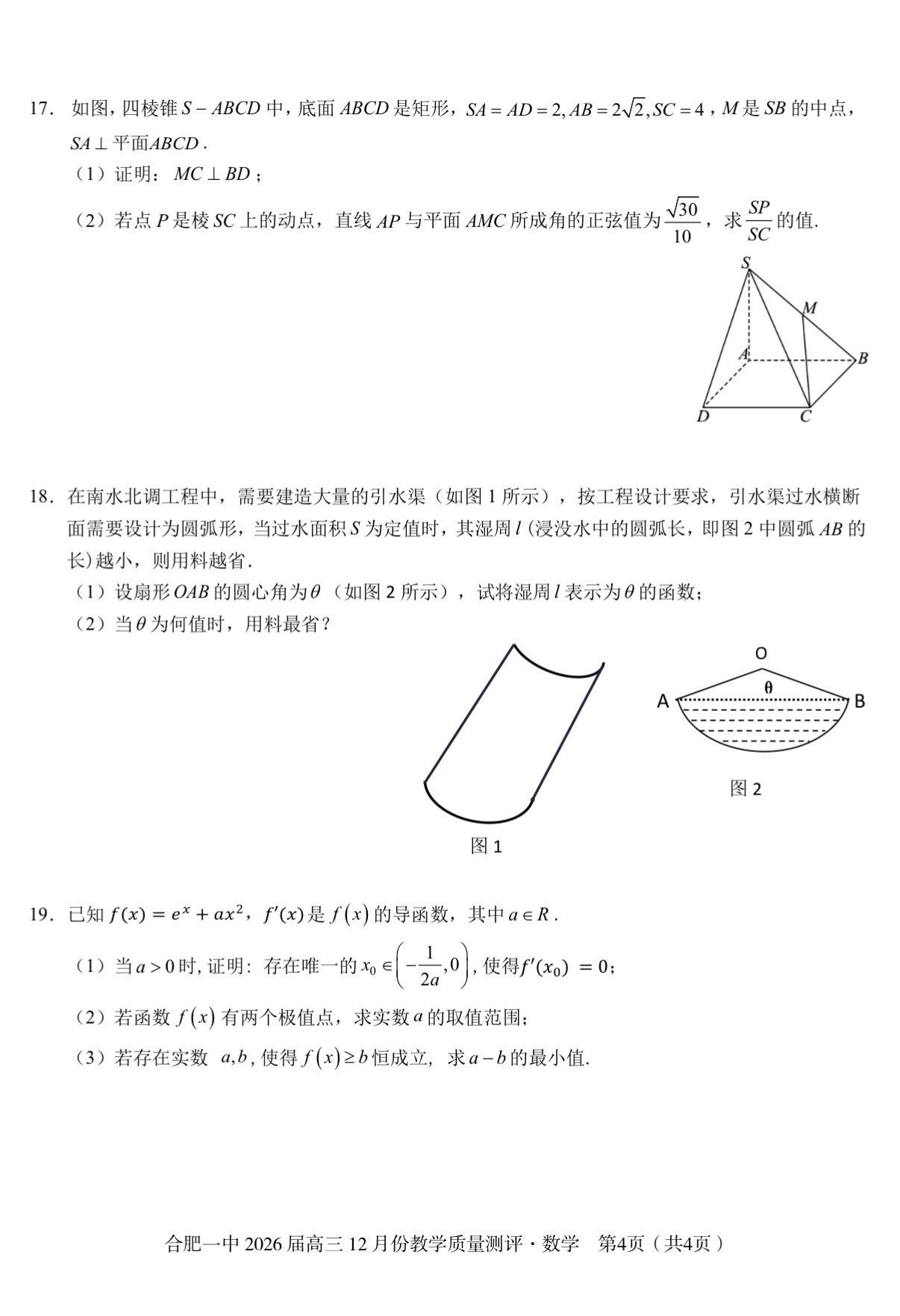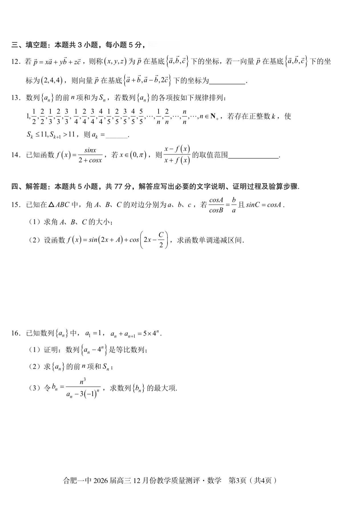 合肥一中2026届高三12月月考数学试题,因为一轮复习没结束,概率、解析几何没考