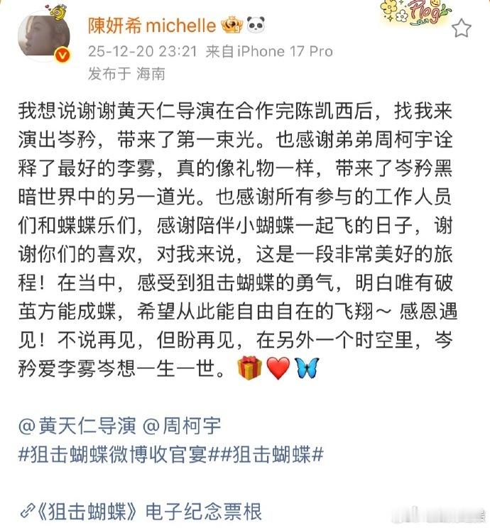 狙击蝴蝶收官日是陈妍希儿子生日陈妍希儿子生日和狙击蝴蝶收官日是同一天 剧里双向救赎终成眷属,剧外温情陪伴共度生日,双重圆满撞个满怀。