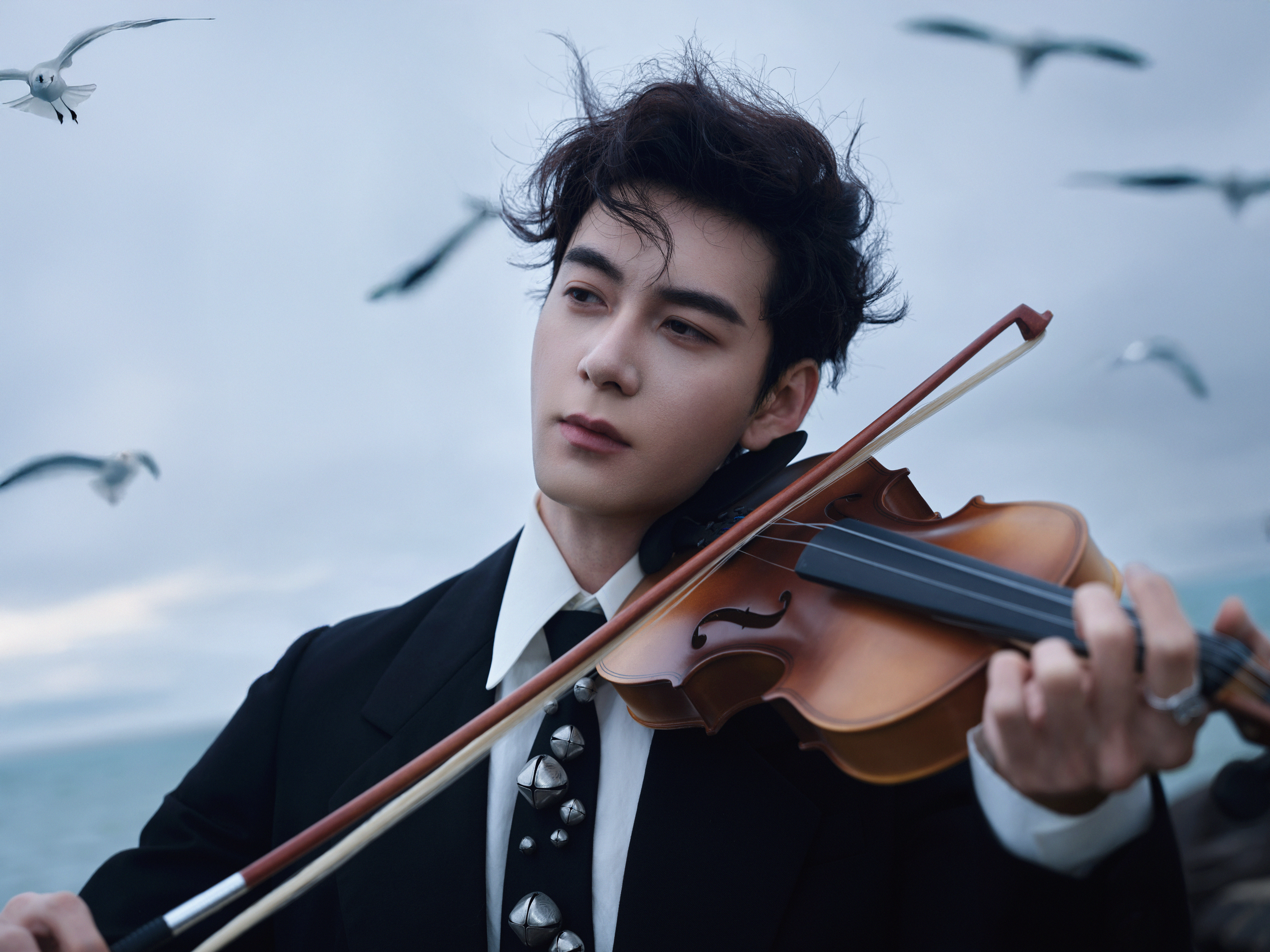 星光大赏出图 他垂眸时,睫影落在鼻梁,手里的小提琴裹着琥珀色的光,像把海浪与云絮都揉进了琴身。鸥鸟掠过的风里,西装的褶皱、指节上的银戒,连琴弓悬着的弧度,都成了这幕里精致的注脚——是生活里出逃的艺术家,把浪漫钉在了潮声与岸石之间。陈星旭星光大赏出发图自带bgm