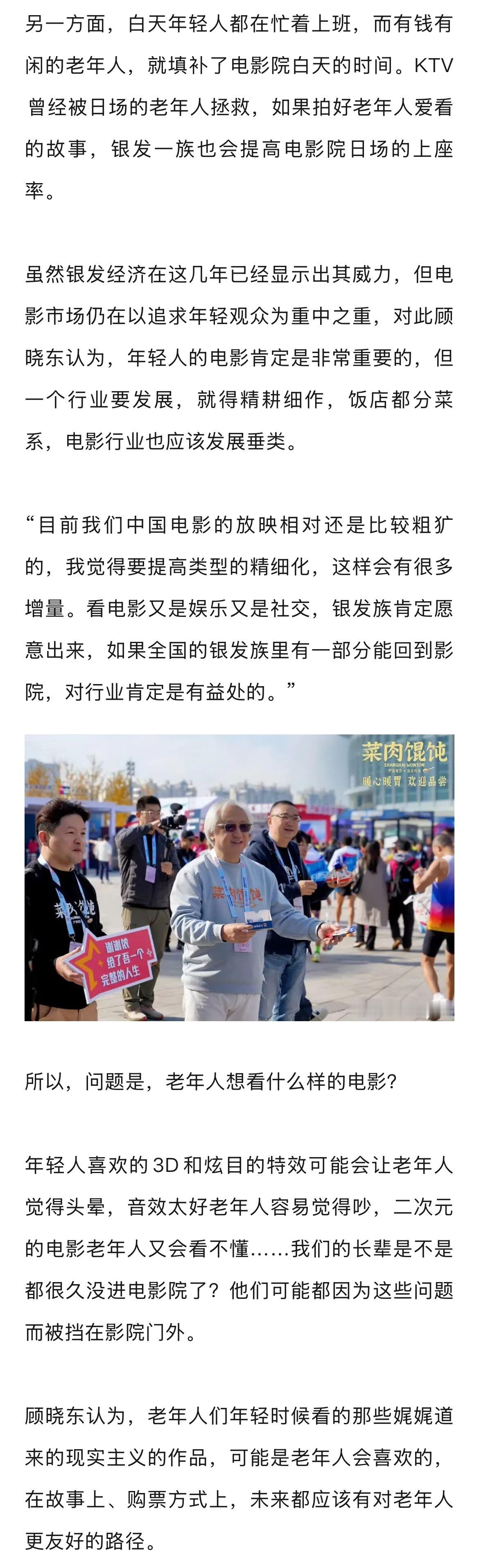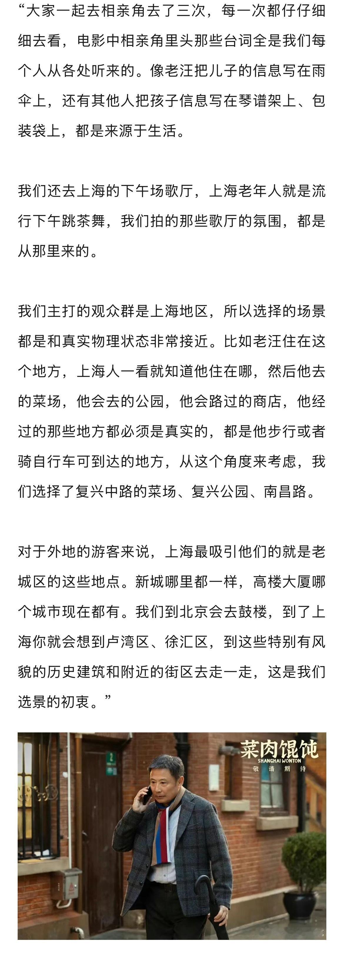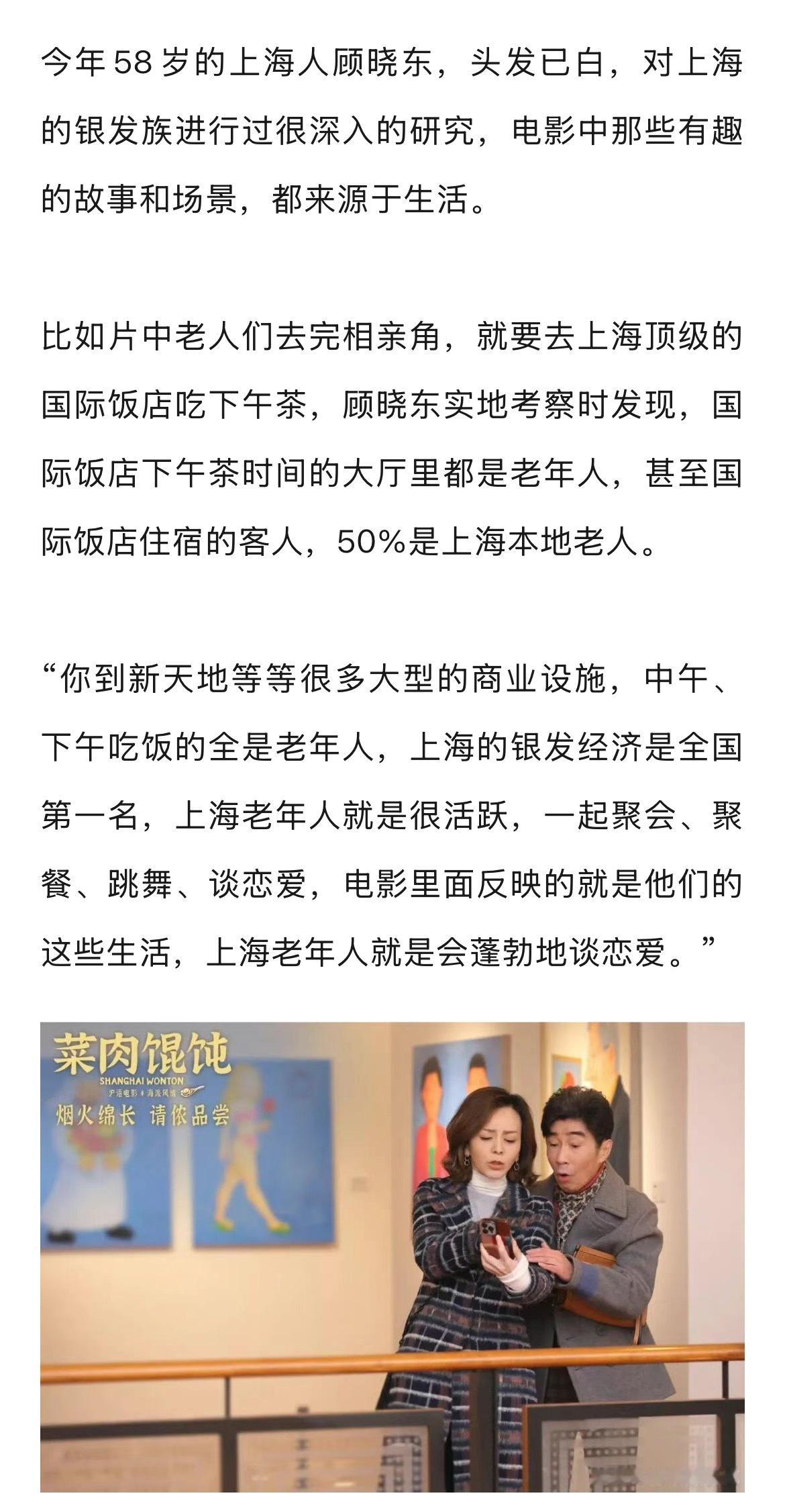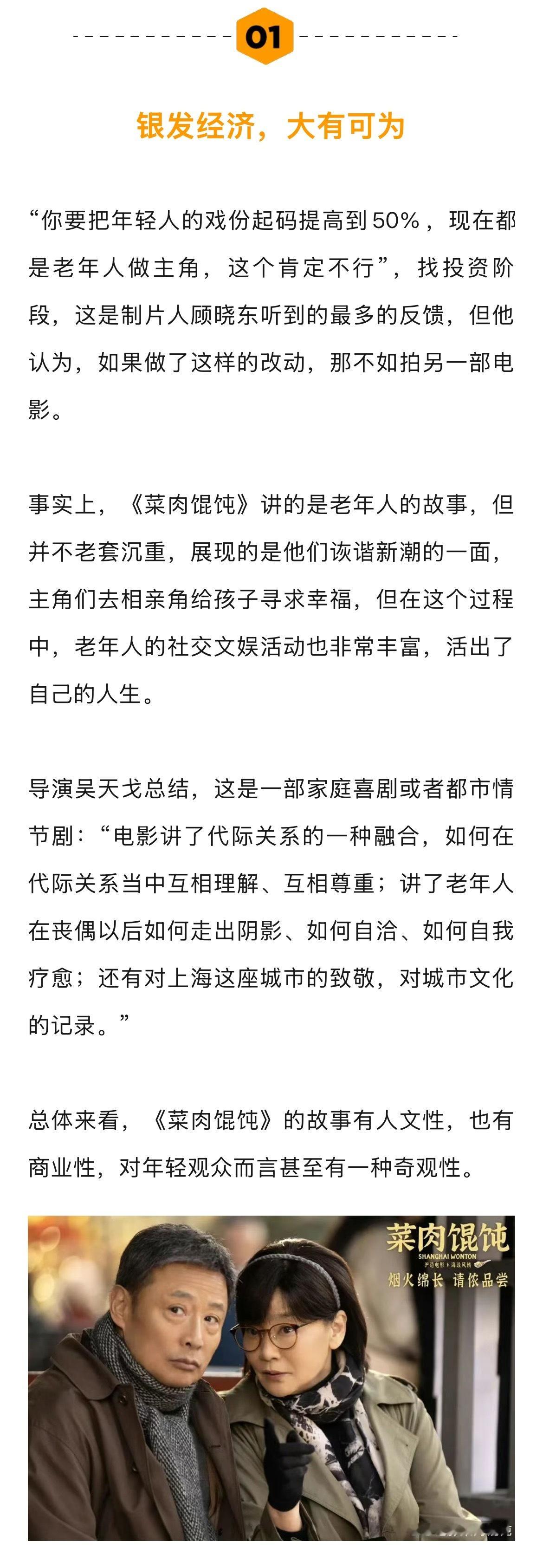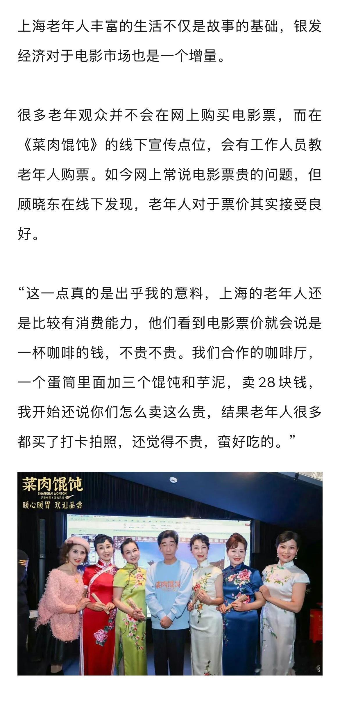 菜肉馄饨做对了什么主创回应菜肉馄饨为何能小爆 《菜肉馄饨》以上海老年人为绝对主角,而当下电影市场的追求是要贴近年轻观众、要走全国路线,这个与市场趋势看似格格不入的项目难免遇冷。但顾晓东当时就像谈恋爱上头了一样,一定要把电影拍出来,没人投资,就自己抵押房产一个人扛下来,硬撑着开机,他有几个信心来源:当下电影成本越来越高,而票房也集中在头部的项目里,需要寻找新的路径;邵艺辉导演的《爱情神话》给他很大的启发,沪语电影可以在上海本地获得极大的成功;上海本身就有市民电影的类型传统,比如《乌鸦与麻雀》《十字街头》《女理发师》《太太万岁》;上海是一个老龄化严重的城市,银发经济在上海表现突出,白天的各种消费场景,都靠老年人撑场面。截至目前,《菜肉馄饨》的2640万票房中,上海城市票房就高达2556万,之前《爱情神话》的2.34亿票房中,上海观众贡献了1亿,上海作为中国电影的票仓城市,为上海地域电影提供了有力支撑。那么,只有这样的大票仓,才能养得起面向本土的电影吗?导演吴天戈介绍,其实潮汕地区早有先例,“他们用三五百万的成本,就拍潮汕话的电影,全国其他地方都看不到,只有潮汕地区有,拍了以后卖个1000多万,就回本了,然后就继续拍,我认为这样的经验在全国任何一个地区都值得推广。上海话其实是个小语种方言,说上海话的人不多的,像整个西南地区,云贵川的语言全部都是通的,还有像河南这样的人口大省,我觉得都有条件,每个地区都有特定的历史和文化,有它的风土人情,那就值得挖掘。”制片人顾晓东也向新浪娱乐工作室表示,本地的方言就是中国文化特别生动的一部分,全国很多地方都可以做这种垂直细分市场,“现在也有云南新浪潮、浙江新浪潮,你看毕赣、饶晓志导演都是贵州的,贾樟柯导演很早就开始拍山西的电影…”娱理独家↓