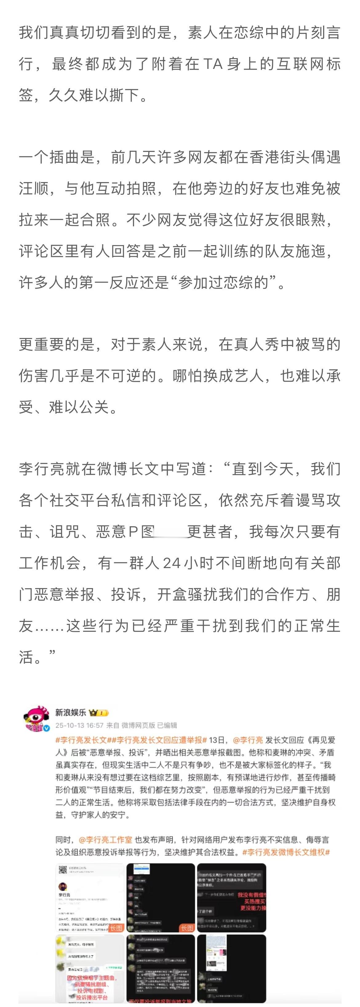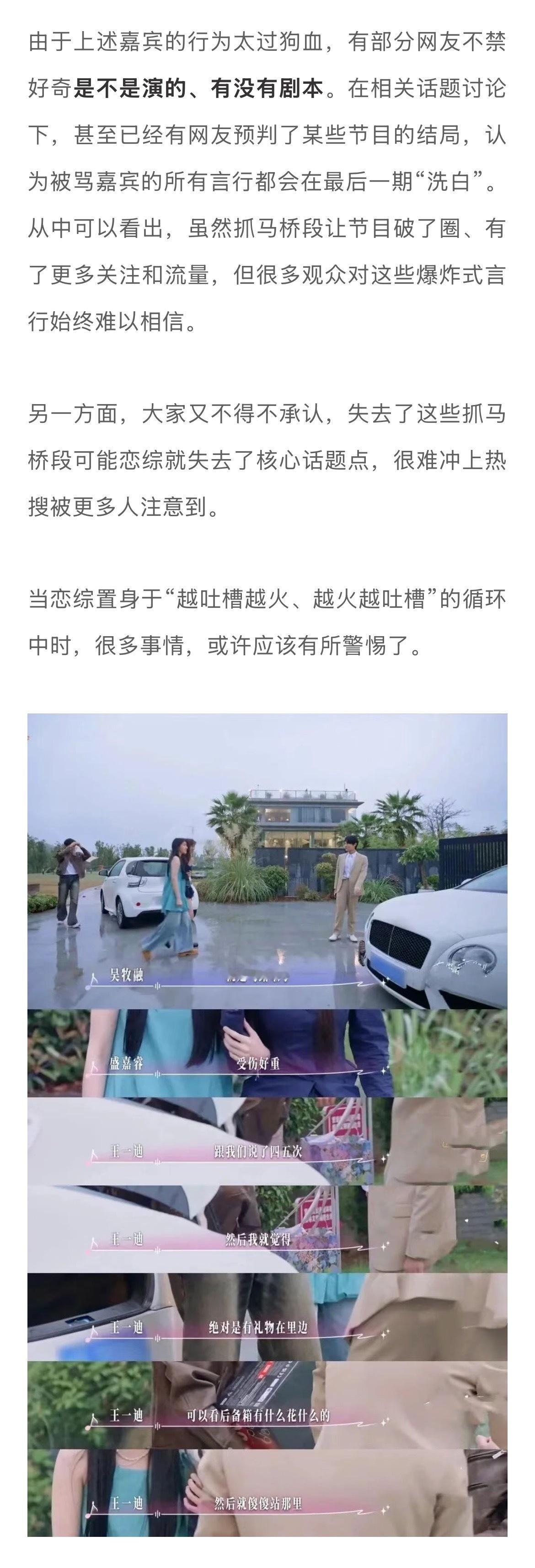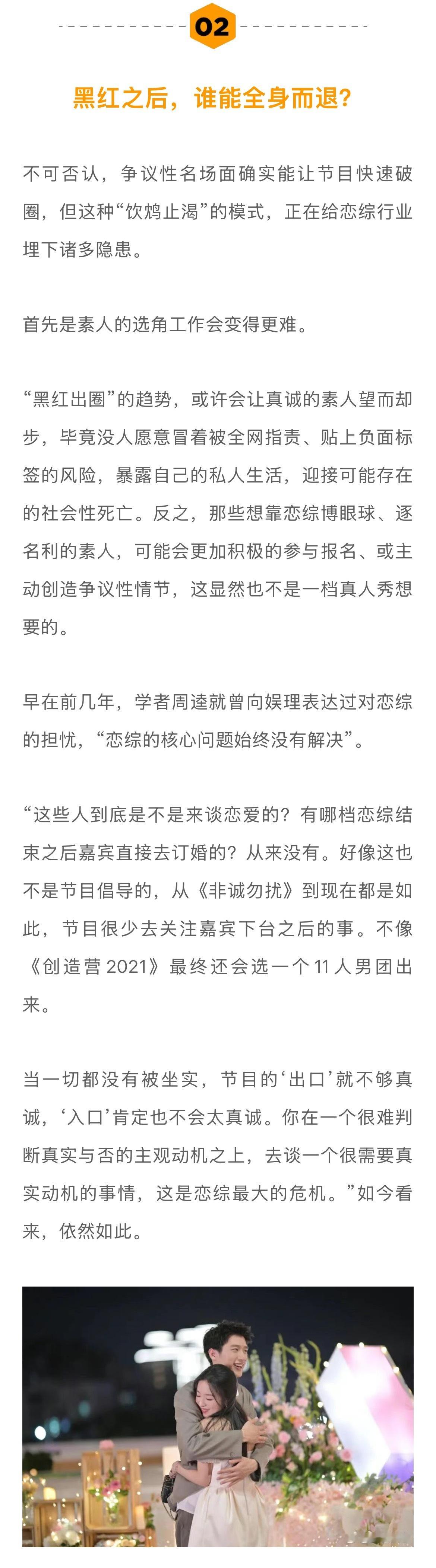 恋综靠狗血出圈是好事吗如何看待王梓莼宾利哥出圈 争议性名场面确实能让节目快速破圈,但这种“饮鸩止渴”的模式,正在给恋综行业埋下诸多隐患,比如选人难:“黑红出圈”的趋势,或许会让真诚的素人望而却步,毕竟没人愿意冒着被全网指责、贴上负面标签的风险,暴露自己的私人生活,迎接可能存在的社会性死亡。通过过往,我们真真切切看到的是,素人在恋综中的片刻言行,最终都成为了附着在TA身上的互联网标签,久久难以撕下。一个插曲是,前几天许多网友都在香港街头偶遇汪顺,与他互动拍照,在他旁边的好友也难免被拉来一起合照。不少网友觉得这位好友很眼熟,评论区里有人回答是之前一起训练的队友施迤,许多人的第一反应还是“参加过恋综的”。更重要的是,对于素人来说,在真人秀中被骂的伤害几乎是不可逆的。面对流量的诱惑,恋综还是应该回归初心,缔造甜蜜和美好。素人自身也需保持清醒。如果抱着“靠争议出圈”的心态参加节目,往往只会反噬自身。最后,也呼吁观众可以多一份理性看待恋综、乃至所有真人秀…娱理独家↓
