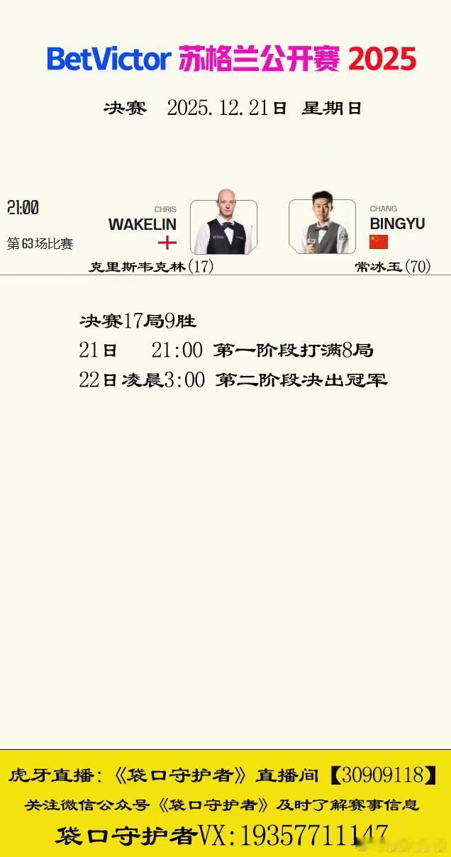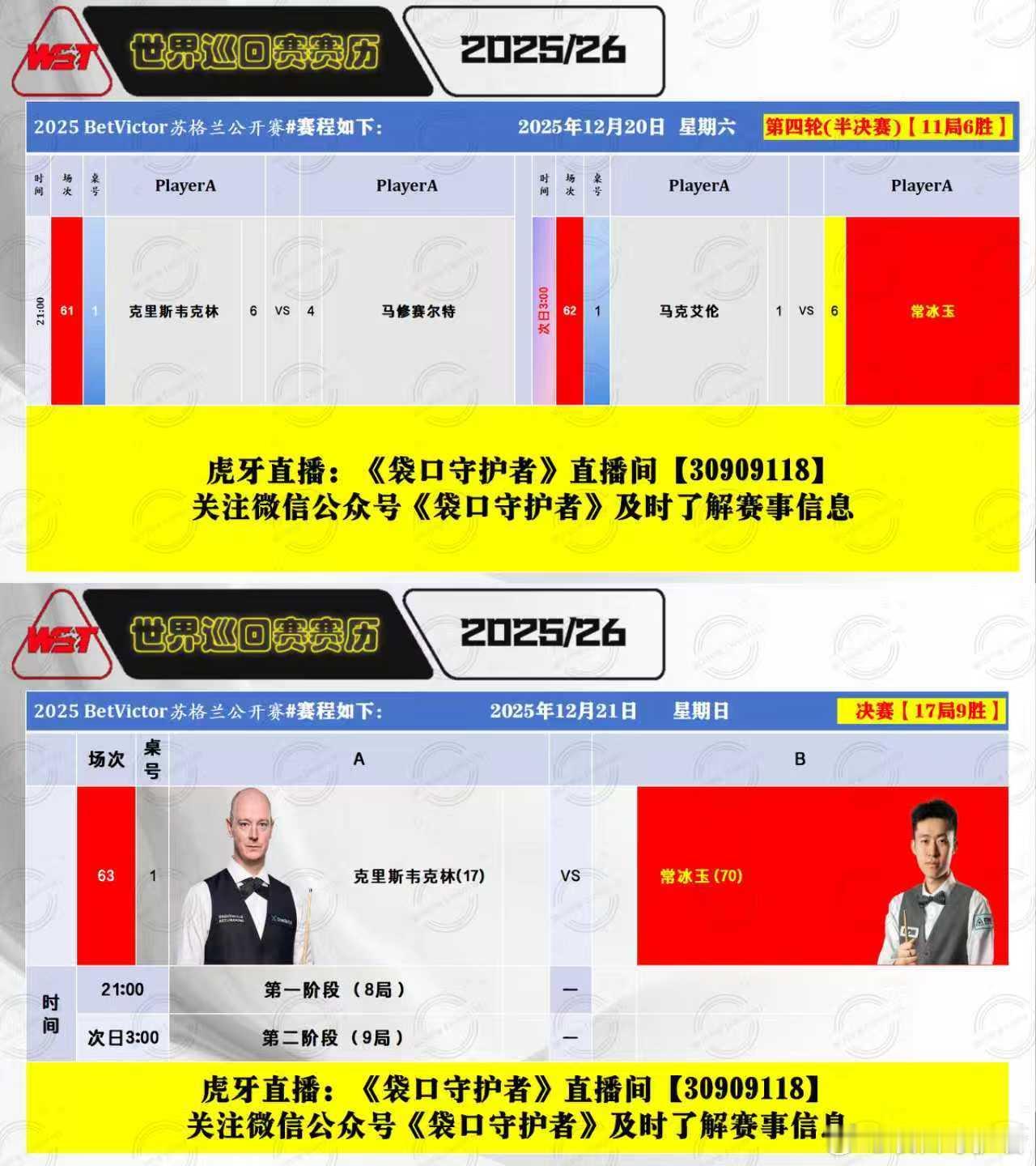 2025苏格兰公开赛第七天决赛(17局9胜)中国选手常冰玉晋级决赛;2025.12.21日 星期日 第一阶段打满8局21:00 直播:常冰玉VS克里斯韦克林2025.12.22日 星期一 第一阶段决出冠军3:00直播:常冰玉VS克里斯韦克林