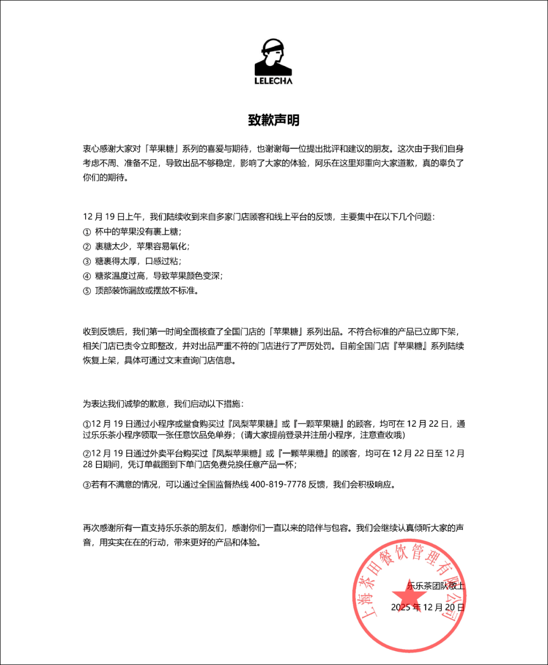 收到反馈后,我们第一时间全面核查了全国门店的「苹果糖」系列出品。不符合标准的产品已立即下架,相关门店已责令立即整改,并对出品严重不符的门店进行了严厉处罚。