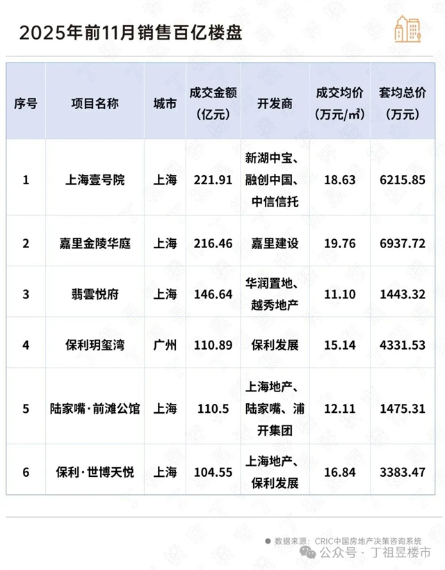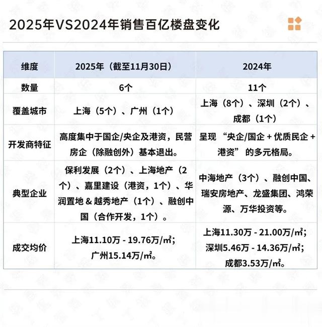 截至11月底,今年全国销售超过百亿的楼盘有6个,比去年同期多了1个,但比2024年全年少了5个。