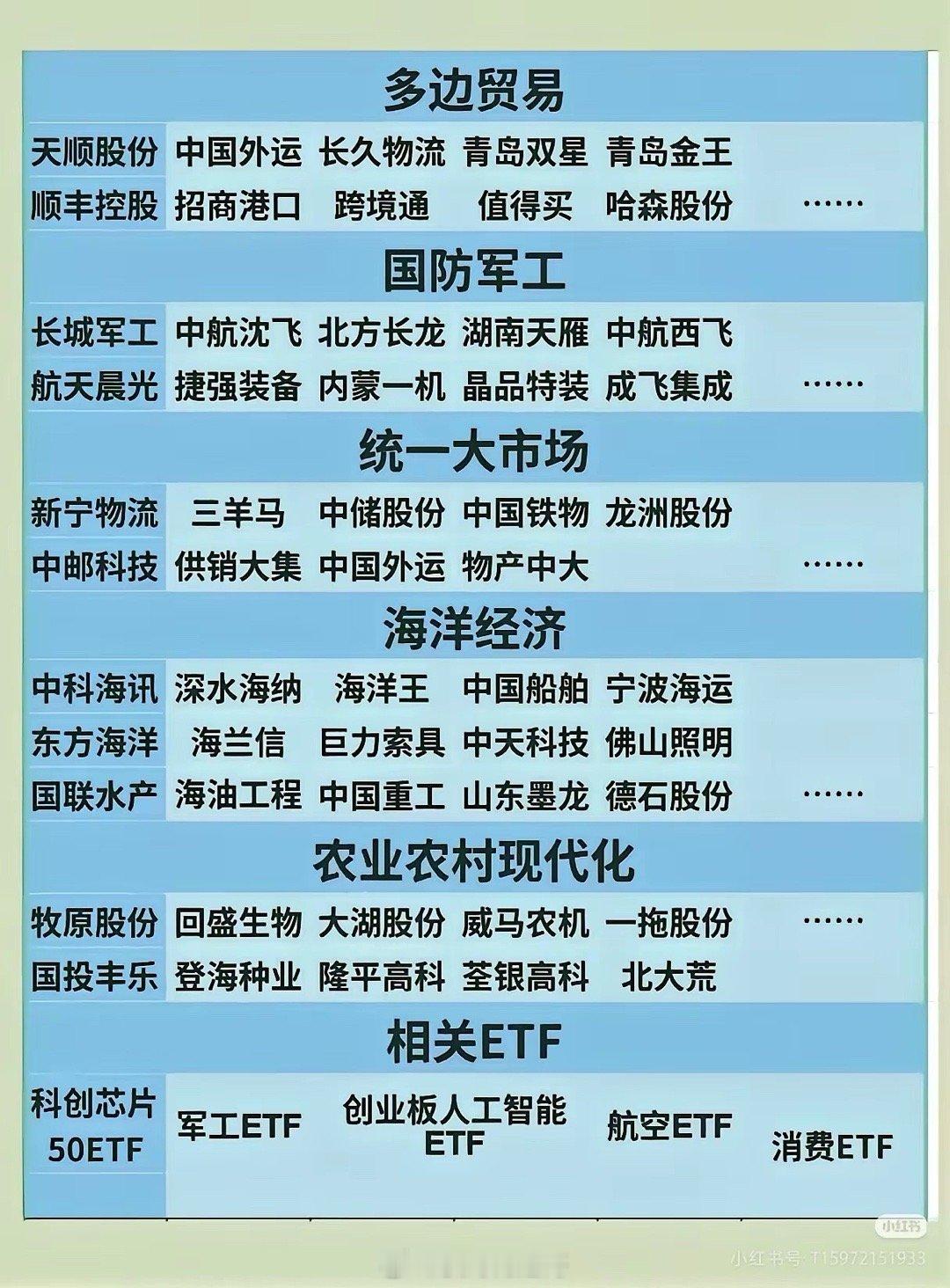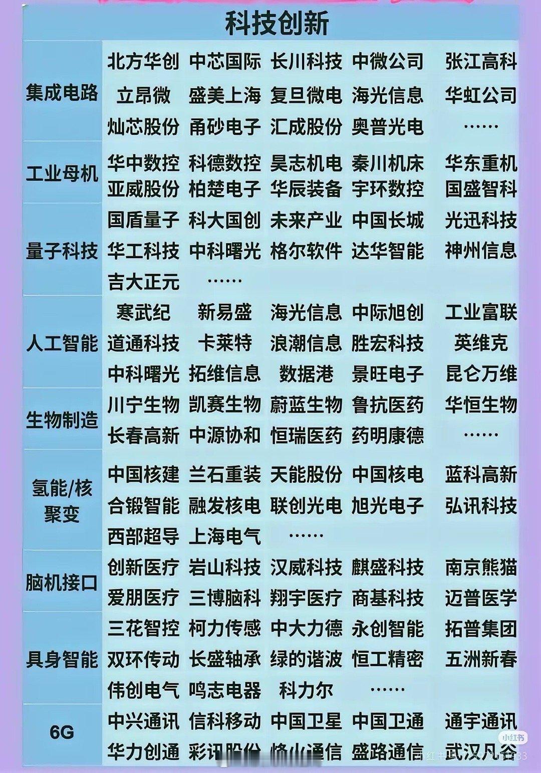 科技创新产业及企业(收藏研究):1. 聚焦科技创新,列集成电路、工业母机、量子科技、人工智能、生物制造、氢能/核聚变、脑机接口、具身智能、6G等领域及代表企业;2. 新兴支柱产业(新材料、新能源、低空经济、航空航天)与民生普惠(生育养老、教育医疗、内需消费、地下管网),附各领域企业;3. 多边贸易、国防军工、统一大市场、海洋经济、农业农村现代化等板块及对应企业,并列出相关ETF(如科创芯片50ETF、军工ETF等)。