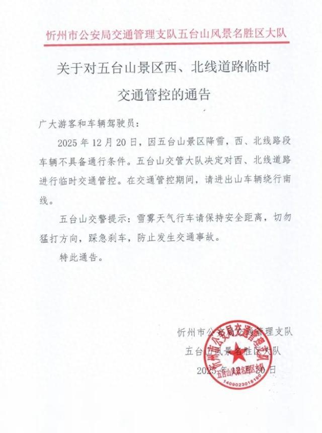 12月20日,忻州市公安局交通管理支队五台山风景名胜区大队发布关于对五台山景区西、北线道路临时交通管控的通告。因五台山景区降雪,西、北线路段车辆不具备通行条件。五台山交管大队决定对西、北线道路进行临时交通管控。在交通管控期间,请进出山车辆绕行南线。