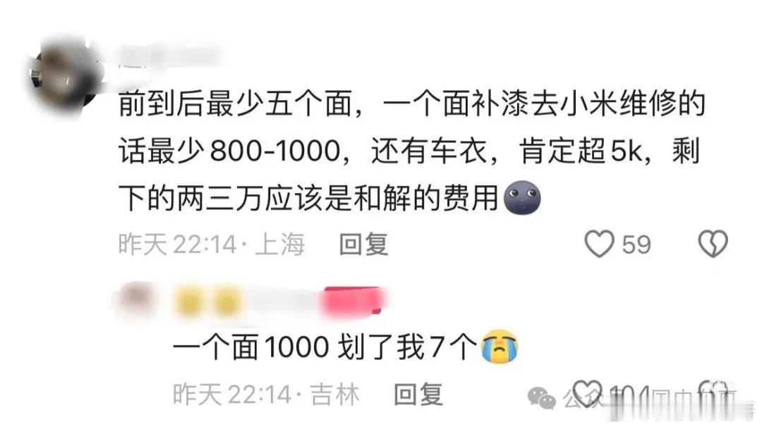 这事儿挺典型的,给所有“手欠”的人提了个醒。事情经过:一车主把车正常停地库,被人用利器划了七个面。好在车子有“哨兵模式”,把整个划车过程都录了下来。车主报警后,警方很快锁定了肇事者。关键点:赔偿金额大:车用的是小米汽车的巴斯夫鹦鹉漆,划伤七个面,一面1000元,再加上15800元的车衣,总损失两万多。性质变严重了:根据法律规定,故意毁坏财物损失超过5000元就构成刑事犯罪。这两万多的金额,远远超过了立案标准。一句话点评:这事儿说明,现在很多智能汽车都有“哨兵模式”这种“电子眼”,干坏事很容易被逮到。更重要的是,划车这种看似“小事”,一旦损失金额上去,就从民事纠纷变成刑事案件了。肇事者如果不能取得车主谅解,赔钱是小事,还可能得进去“蹲几天”。真是“手一滑,代价大”。