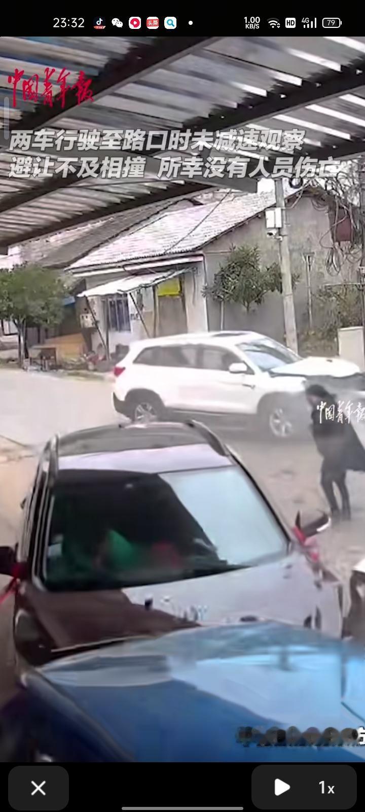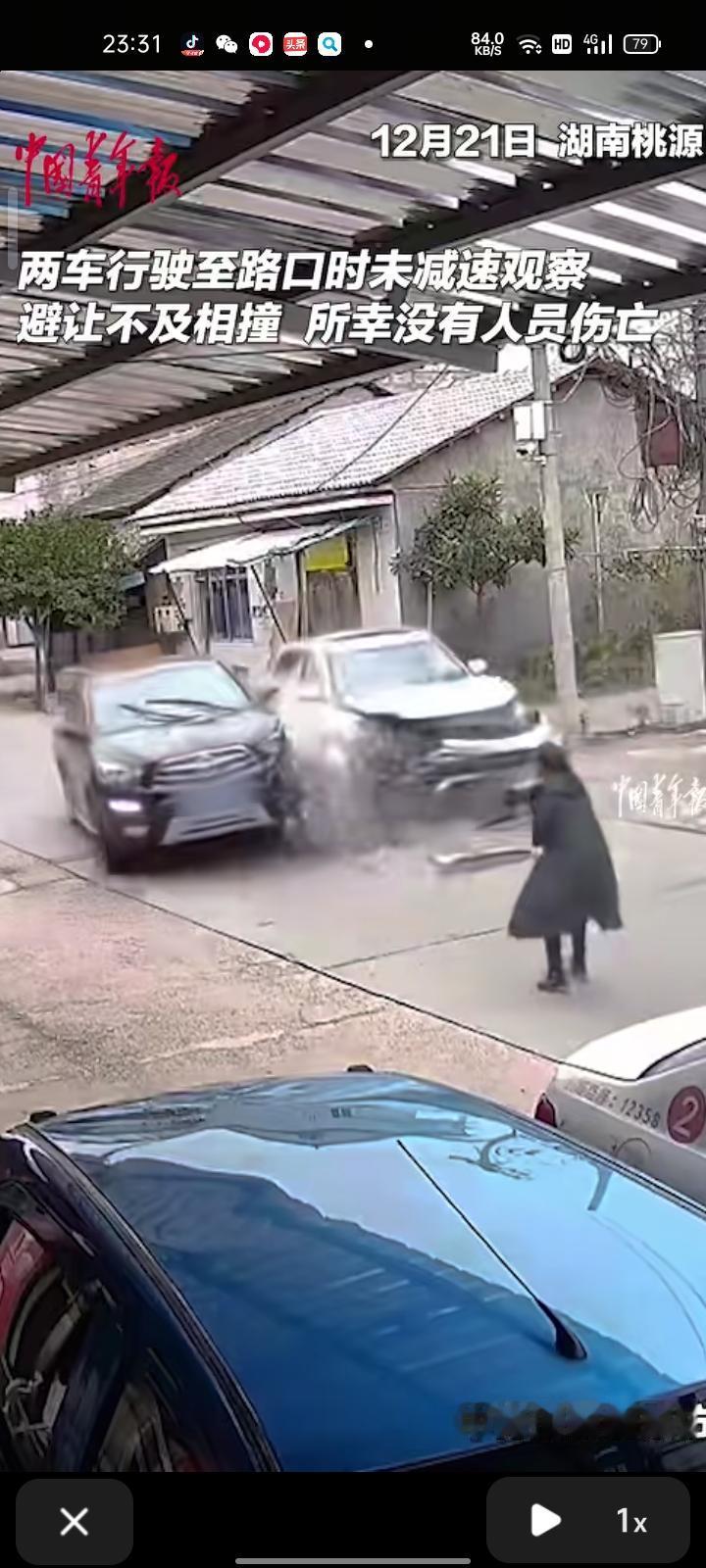 12月21日,常德市桃源县。监控画面显示,两车行驶路口时未减速观察,避让不及相撞,所幸无人伤亡。视频拍摄者称,他们俩的速度有点快就撞上了,在经过小路或者十字路口的时候,各位司机还是要慢一点,要确保安全。