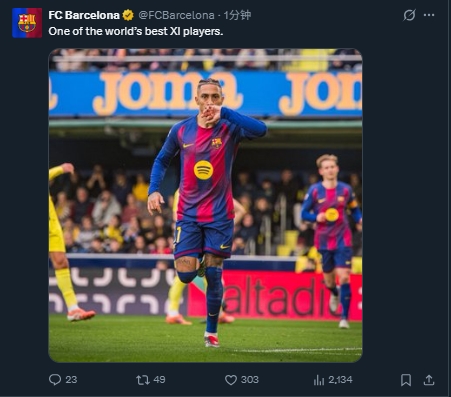 本场比赛后,巴萨官方社媒账号晒出了拉菲尼亚的赛场照,并配文:“世界上最好的11个球员之一。”