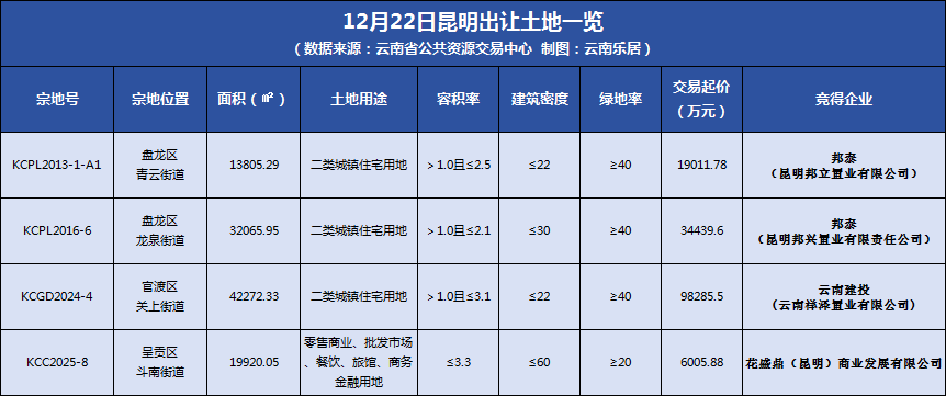 KCGD2024-4号地块以98285.5万元底价被云南建投(云南祥泽置业有限公司)竞得。
