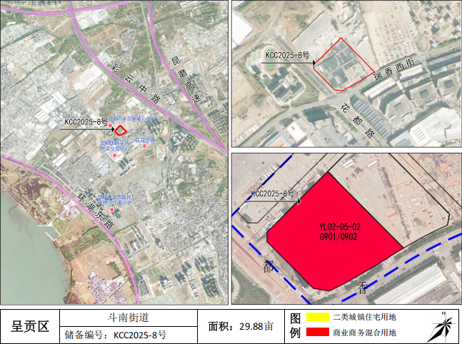 KCC2025-8号地块面积19920.05㎡(约29.88亩),土地用途为零售商业、批发市场、餐饮、旅馆、商务金融用地,容积率≤3.3,建筑密度≤60%,绿地率≥20%,交易起价6005.88万元。