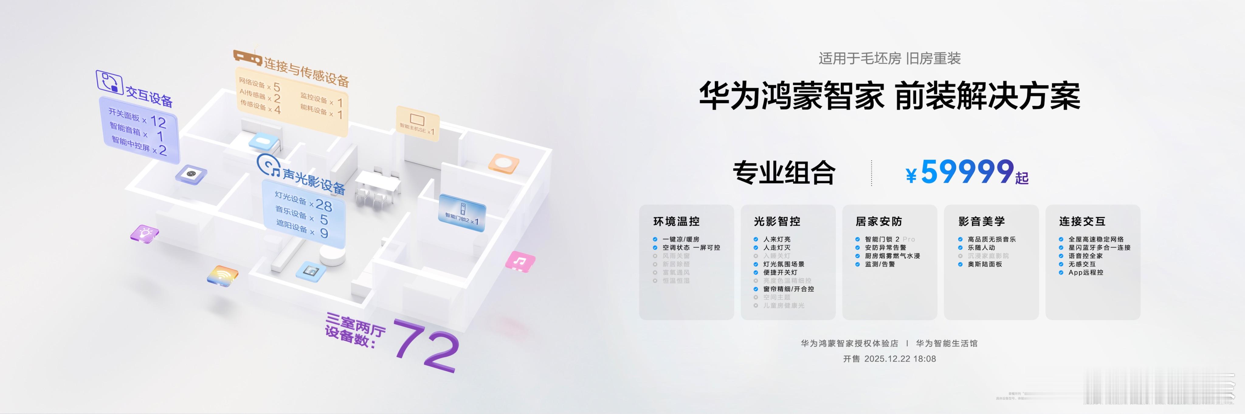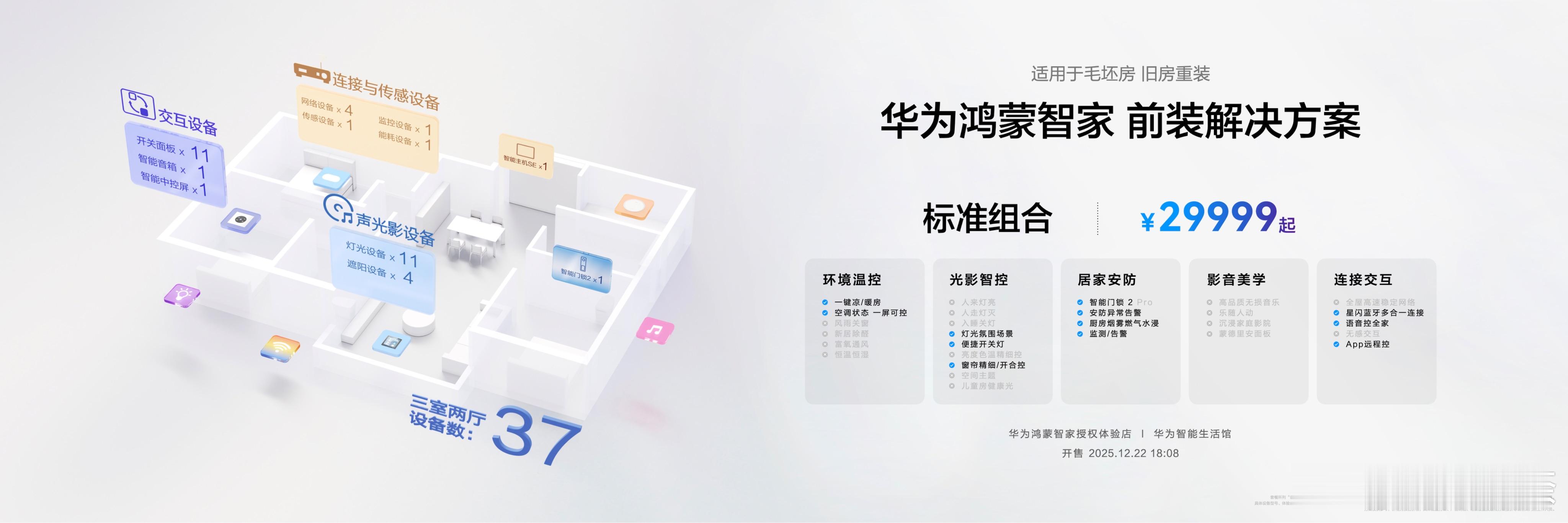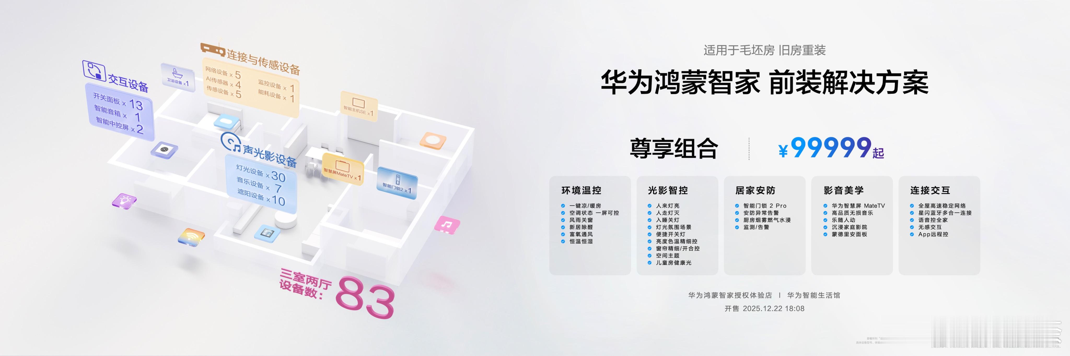 华为鸿蒙智家新品是一次行业内领先的“技术普惠”!华为全屋智能套装售价9999元起想怎么装就怎么装打进消费者心中。全系搭载PLC连接技术保障极致稳定,新一代小艺管家实现更自然的语音交互。针对90㎡三室两厅户型,前装三款从标准设施到尊享影音美学全面覆盖;后装三款则专注无损升级,24h免布线不拆墙,极速焕新你的新家。最低9999就可以满足从基础安防到健康关怀、沉浸影音的不同需求。科技博主建议:年轻夫妻可选后装尝鲜组合轻松入门;有娃家庭重点考虑前装专业组合的睡眠辅助与安防升级;追求极致体验则可一步到位选择前装尊享组合,享受全屋环绕音和RGBCW光影氛围。华为鸿蒙智家精装房市场占有率第一了,一起加入智能家居生活,给你一个不一样的全新智慧体验。