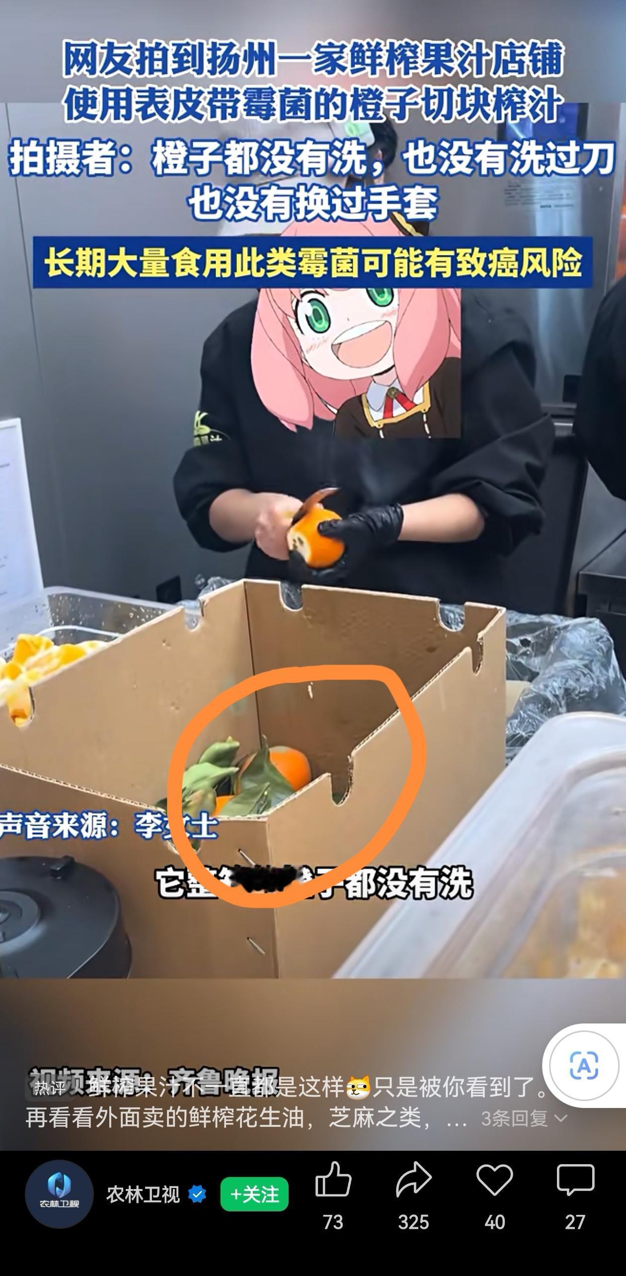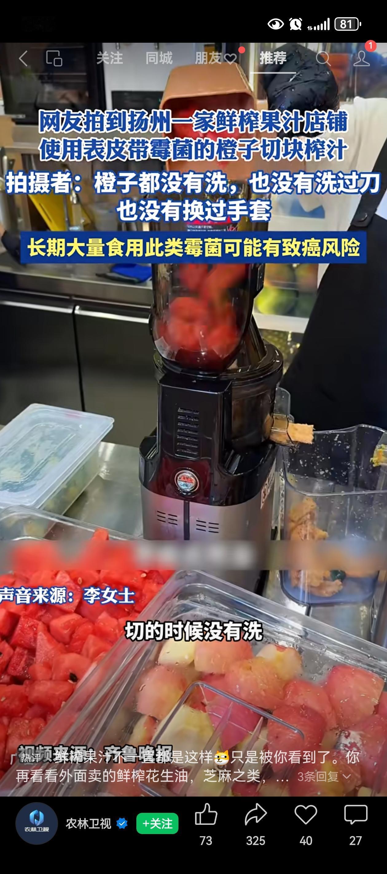 鲜榨果汁新鲜吗?12月21日,网友曝光扬州万象汇负一层一家鲜榨果汁店,店员用表皮带霉菌的橙子榨汁,且橙子未清洗、刀具和手套未更换,存在严重交叉污染风险。 “我拍的时候就发现,那箱橙子皮居然有发霉的” “然后他那个手套也没有换,就全粘在手套上,手套上又粘在那个橙子肉上,整个橙子都污染了” “切的时候没有洗,整箱橙子都没有洗,也没有洗过刀,也没有换过手套”。 网友很气愤,因为看到员工戴着手套,第一反应是“这是为了保护食物”。但现实里,可能恰恰相反,手套更像是员工给自己手部的一层“防护”,而不是给食物的保障。 顾客觉得员工戴了手套就等于“干净”了?结果同一双手套,摸了钱、擦了台面、又碰了手机……回头直接处理食物,满手套都是细菌! 手套不换,比手还脏吧?还不如不戴,勤洗手呢! 食品安全卫生只看戴不戴手套不行啦!“手套”只是门面,干不干净只有自己知道吧? 信息来源:农林卫视