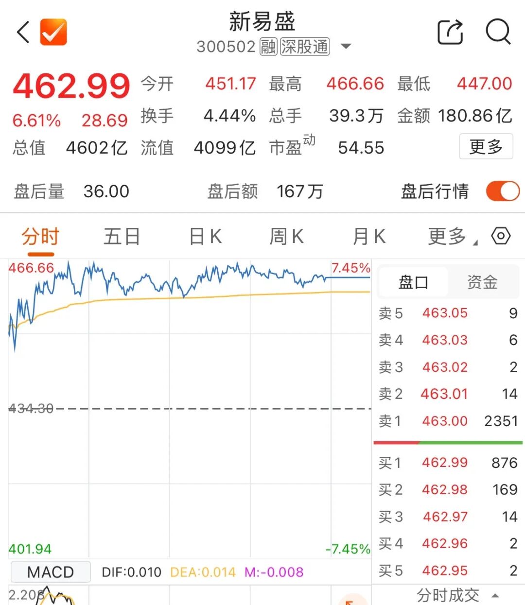 12月22日,CPO概念强势上涨,光模块巨头新易盛盘中一度涨超7%,盘中最高涨至466.66元/股,股价再创历史新高。截至收盘,新易盛报462.99元/股,涨6.61%,总市值4602亿元,成交额180.86亿元,位居A股第二。