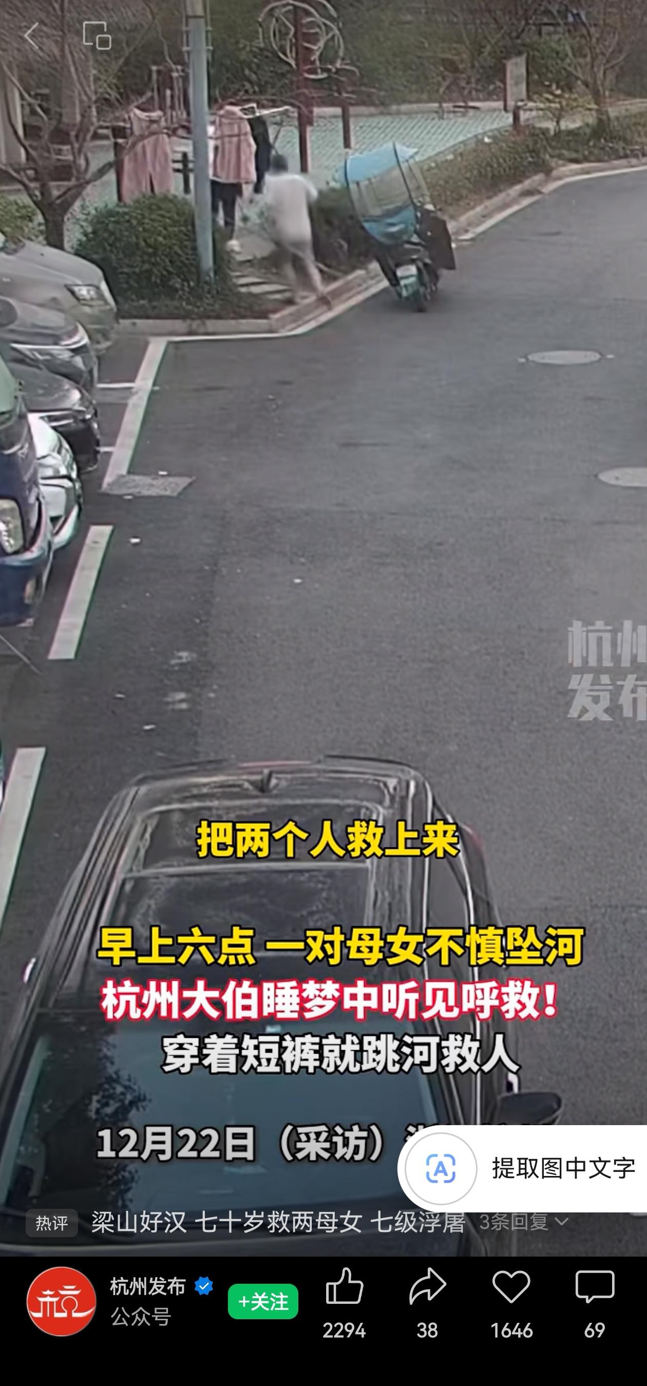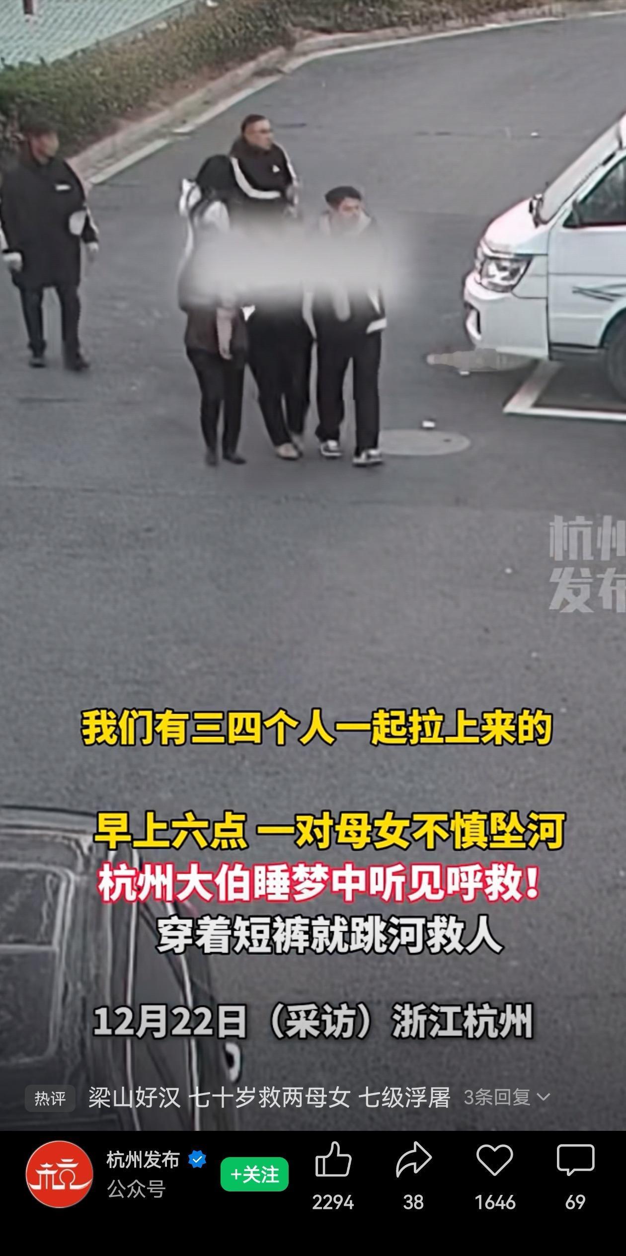 老百姓真英雄!12月15日的杭州,清晨6点,气温只有几度。 突然有急促的呼救声,一下惊醒了睡梦中的洪大爷。当他听到有人落水后,立刻从房里冲出来,没来得及穿上外衣,没有半点没犹豫,只穿了条短裤短袖就往河边冲! 70几岁的洪大爷在家门口抄起一根竹竿,一头跳进进刺骨的河水里,奋力将母女二人救了起来! 洪大爷说他为了救着母女俩,手脚都被擦破了,血都渗了出来。12月的杭州,河里的水得有多冰!别说跳下去了! 洪大爷这么大年纪,泡在冰水里,得多伤身体。可老爷子事后说起来还挺轻描淡写,就觉得做了件该做的平常事。 洪大爷,“硬邦邦”的真英雄! 为洪大爷不分年龄的英雄气概点赞!这份“豪横”,是刻在骨子里的善良和担当。杭州城,又多了位让人暖心的“爷叔”! 祝洪老爷子身体一直这么硬朗! 信息来源:杭州发布