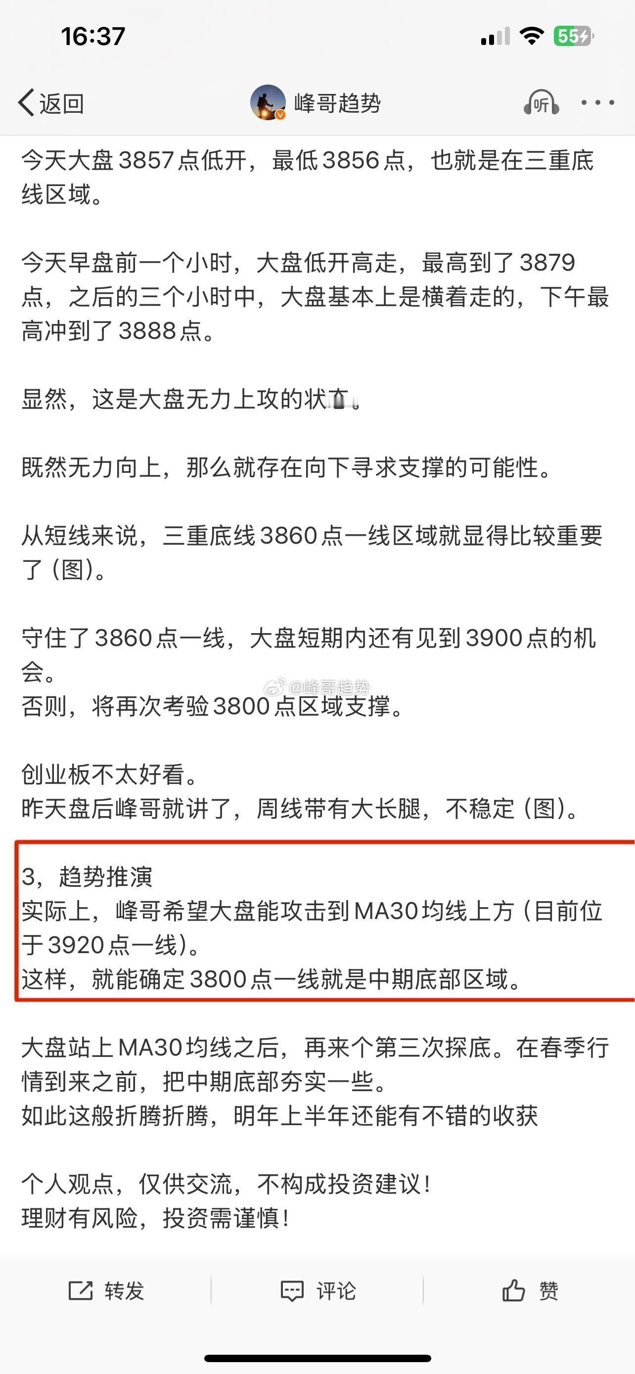 A股:今天大盘的上涨虽然不是反转,但基本上确定3800点一线是中期底部区域,未来大盘的震荡区间也就基本确定了。12月18日的时候(图),峰哥说过。希望大盘攻击到中期均线上方,如此,便能确定3800点一线是中期底部区域。未来一段时期内,大盘震荡整理区间大概率是在3800~4000点区域。今天沪深两市放量上涨,沪市最高点是3920.01点,只比3920点多了0.01点(图)。这些主力有点小家子气!今天市场受到利好消息刺激,高开高走。如此一来,分时均线偏离值又变大了,为市场回踩埋下了伏笔。大盘回踩的级别,是分时级别还是日线级别,目前还不能确定。海南板块与福建板块炒作逻辑相似,都是源于政策。有政策衬托,被“风险警示”的概率小一点。商业航天继续分化,低位的股票补涨,高位的股票则走软了。受到利好消息刺激的科技板块,今天强势明显。AI硬件,芯片,光刻机(胶)等方向都有不俗表现的股票涌出。这是今天双创领先主板的原因。2800多只股票上涨,2100多只股票下跌。这个数据比早盘逊色了不少。早盘收盘后,上涨个股有3100多只,下跌个股有1600余只。实际上,收盘指数与早盘收盘指数相差不大。说明下午有资金选择了见好就收。周二或者最迟周三,要谨防大盘踩一脚……个人观点,仅供交流,不构成投资建议!理财有风险,投资需谨慎!金价今日看盘a股孟子义摔出了神图