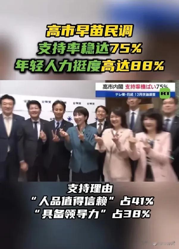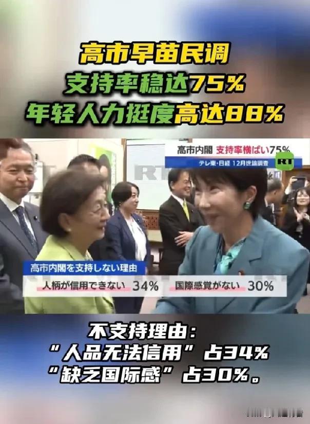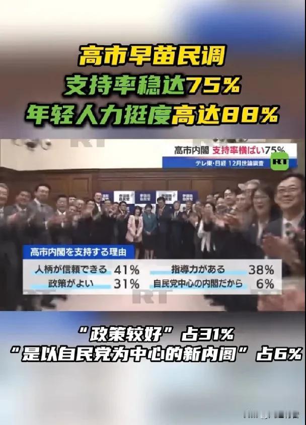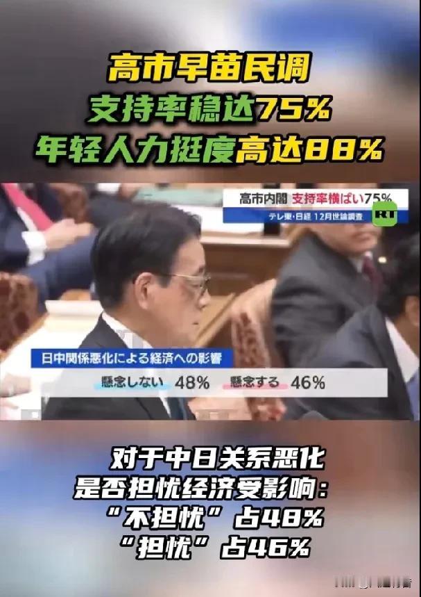 雪崩的时候,没有一片雪花是无辜的:最新民调显示,日本年轻人力挺高市早苗,支持率高达88%。 据《今日俄罗斯》综合《日本经济新闻》、东京电视台及TBS等多家主流媒体12月21和22日报道,最新民调显示,日本首相高市早苗内阁支持率持续保持在75%的高位,与11月调查结果持平。东京广播公司(TBS)等媒体报道指出,高市早苗在日本年轻人中的支持率高达惊人的88%。支持者普遍认为其“人品值得信赖”及“具备指导力”。 在涉及中国相关议题上,民调对于日中关系恶化是否担忧影响经济表现出明显分歧。调查显示,48%的受访者表示“不担忧”,而46%表示“担忧”,评价几乎持平。此外,在不支持该内阁的理由中,“缺乏国际感”(占30%)成为主要因素之一。 在一个多月前的11月16日,日本主流媒体共同社的民调显示,高达69.9%的日本老百姓支持高市早苗内阁,比10月份的调查上升了5.5个百分点。不支持率只有16.5%。朝日新闻的民调显示,高市早苗内阁的支持率为69%,维持历代内阁中罕见的高支持率,不支持率则从19%降至17%。 共同社还询问了最近中日关系的热门话题,那就是普通人如何看待高市早苗声称台海有事就是日本有事可以构成日本的“存亡危急状态”?结果显示,赞成这一表态的为48.8%。反对的占44.2%。这说明多数日本人认可高市早苗的对华态度。 难道高市早苗的涉台谬论及其他挑衅行为,只是其个人错误言行吗?日本民调显示,她的种种挑衅绝非一时兴起,而是有一定民意基础的。对此,想起了法国伏尔泰曾说过一句名言:雪崩的时候,没有一片雪花是无辜的。