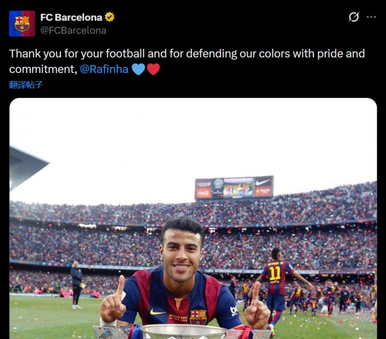 巴萨官方写道:“感谢你带来的足球,以及感谢你以骄傲和责任心捍卫我们的颜色,拉菲尼亚”