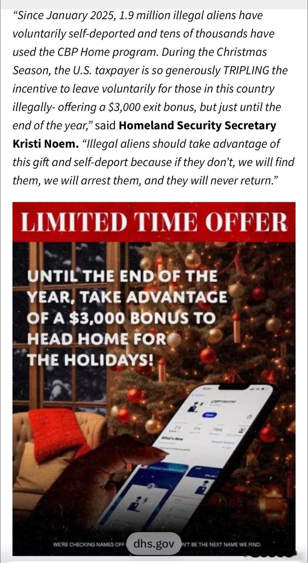 国土安全部:年底前,主动离境的非法移民,在官方APP注册,可得到免费机票和三千美元过节费据官宣,主动离境的,共190万人(平时“奖金“为一千美元)