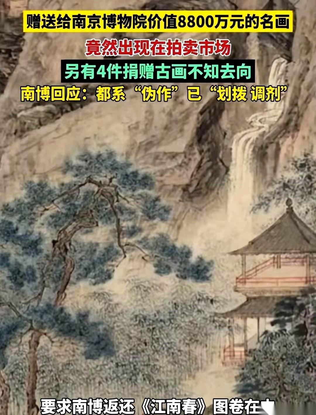 我跟你讲,有些事儿,简直不敢信。 仇英的《江南春》,北宋赵光辅的《双马图》,还有明清大家的三幅画……就这么在南京博物院里,说没就没了? 而且这事儿最骚的操作是啥,你知道吗? 不是被偷了,也不是烧了,是先给你打个“伪作”的标签,然后按“流程”给你处理掉了。 这“流程”走得,真叫一个干净利落。 要不是人家捐赠者的后代自己找上门来问,这几件国宝估计就永远消失在某个“处理伪作”的黑洞里了。 我想想都觉得后背发凉。 人家是出于什么样的信任,才把几代人当命根子一样护着的宝贝,亲手交给你? 图你那点保管费吗?不是。 是图一份心安,图一份传承,图这份美能让更多咱们这样的普通人看到。 结果呢? 你把人家这份滚烫的信任,当成了可以随意处置的废纸。 这丢的哪里是五幅画啊。 丢的是人心,是信誉,是一个国家级殿堂该有的那份担当和敬畏。 希望能找回来吧。 不然,这给所有想为这个社会做点好事的人心里,添多大一个堵啊。
