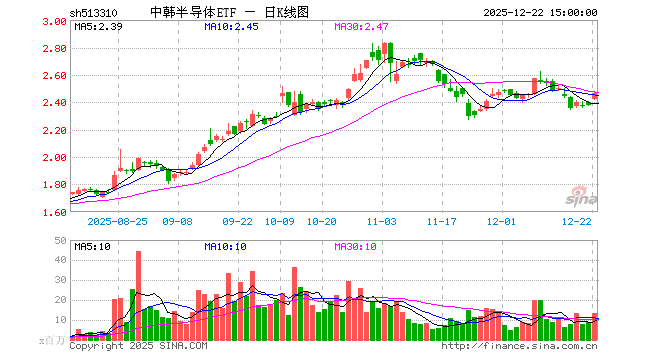 12月22日,中韩半导体ETF(513310)涨3.57%,成交额32.87亿元。当日份额增加500.00万份,最新份额为14.21亿份,近20个交易日份额增加6300.00万份。最新资产净值计算值为34.32亿元。