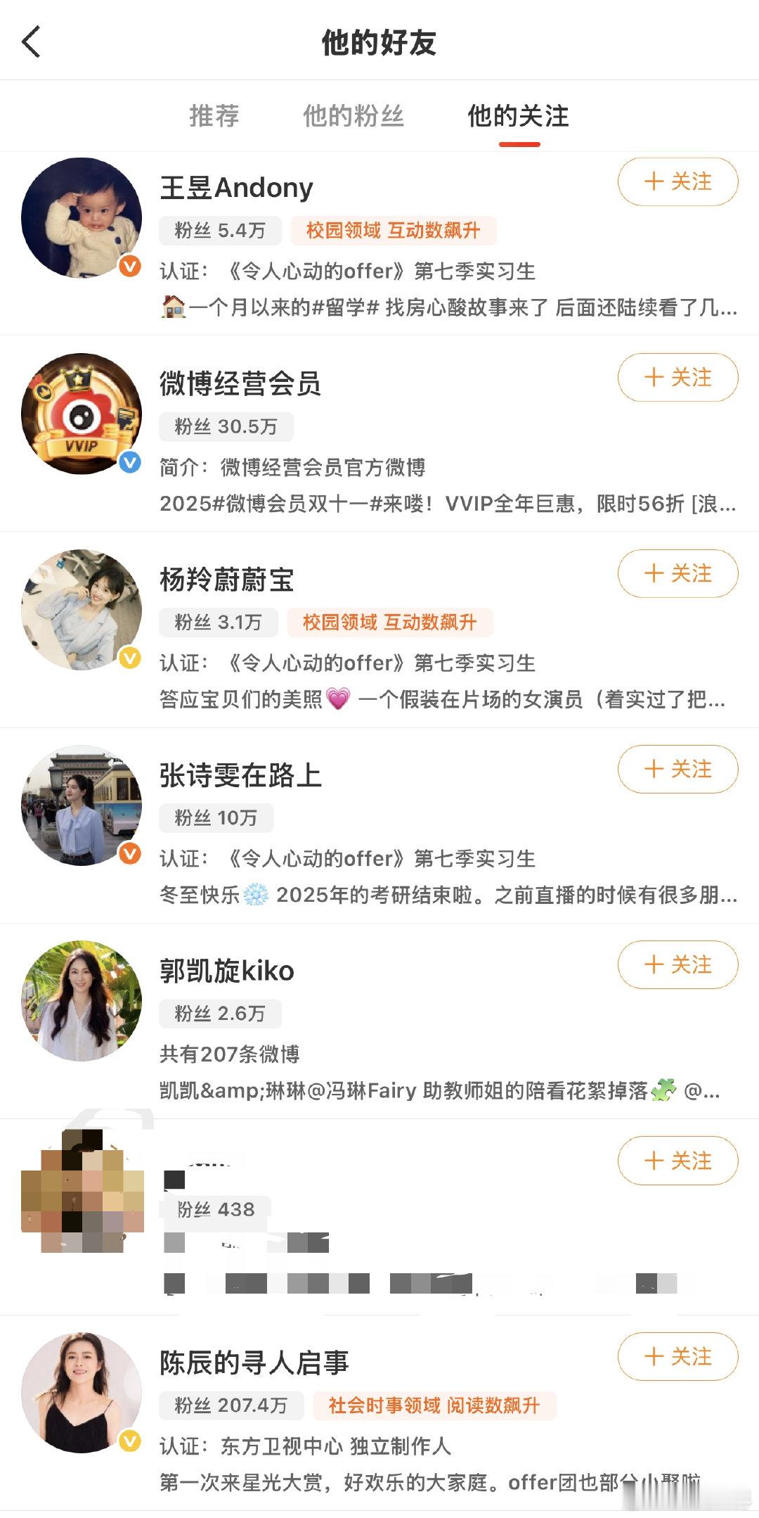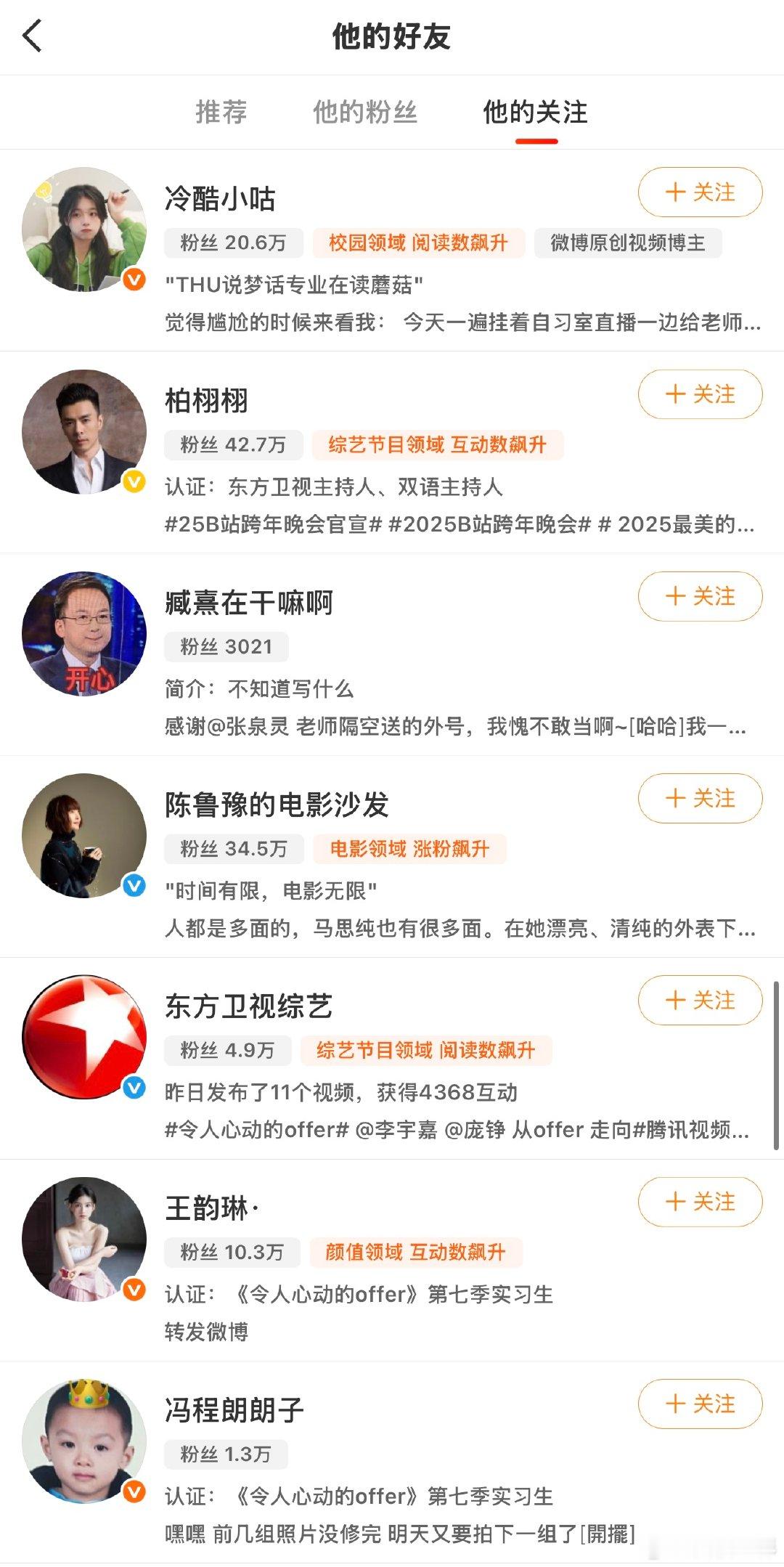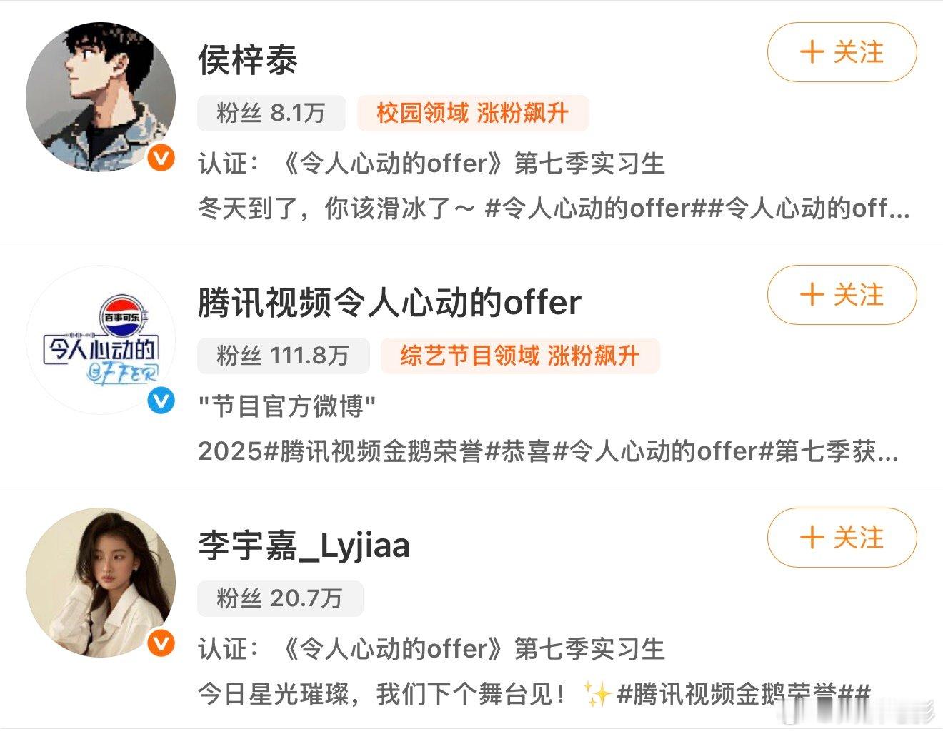 庞铮没关注贺峻霖庞铮疑取关陈铭12月22日,发文对道歉。庞铮对贺峻霖道歉23日观察发现,《令人心动的offer7》加油团里,庞铮关注了王子奇、徐志胜、张泉灵,没有关注贺峻霖和陈铭。但此前庞铮的关注列表显示关注过陈铭,疑似取关。
