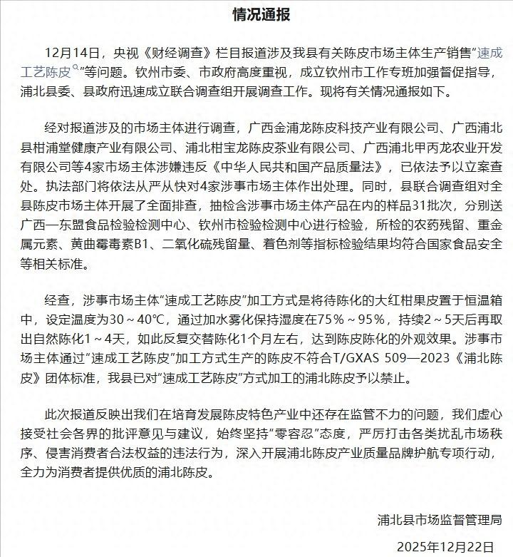 广西浦北市监认为,速成工艺陈皮就不是浦北陈皮,予以禁止。 12月14日,官媒报道广西浦北速成工艺陈皮。随即市监展开调查,12月22日公布调查结果,禁止速成工艺陈皮。 原来市监认为,速成工艺陈皮不是浦北陈皮。但是根据公布的结果,这些速成工艺陈皮的各项指标检验结果均符合国家食品安全等相关标准。 原来速成工艺陈皮,只是加工方式比较现代化,加速了陈皮陈化效果。自然陈化陈皮需3年以上,速成工艺陈化仅需1个月。 这不是好东西吗?有什么理由禁止?而且产量高了,价格会更实惠,让更多的人去消费陈皮。 唯一可能,几乎无法区别自然陈化陈皮与速成工艺陈化陈皮,严重伤害自然陈化陈皮高价。 科技进步已让更多的速成陈皮走上了市场,却因成本太低而被市监禁止,到底什么才是降本增效?
