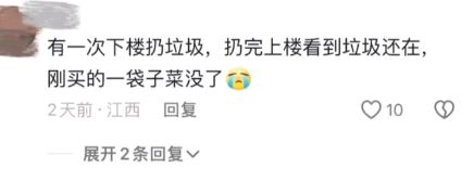 有一次下楼扔垃圾,扔完上楼看到垃圾还在,刚买的一袋子菜没了