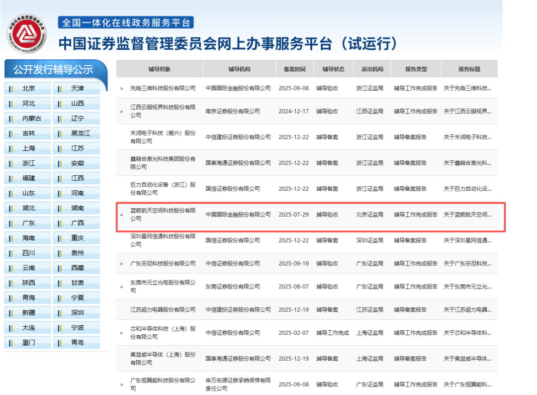 据中国证券监督管理委员会网上办事服务平台披露,近日,蓝箭航天空间科技股份有限公司(下称蓝箭航天)IPO辅导工作正式完成,辅导机构为中国国际金融股份有限公司(下称中金公司)。