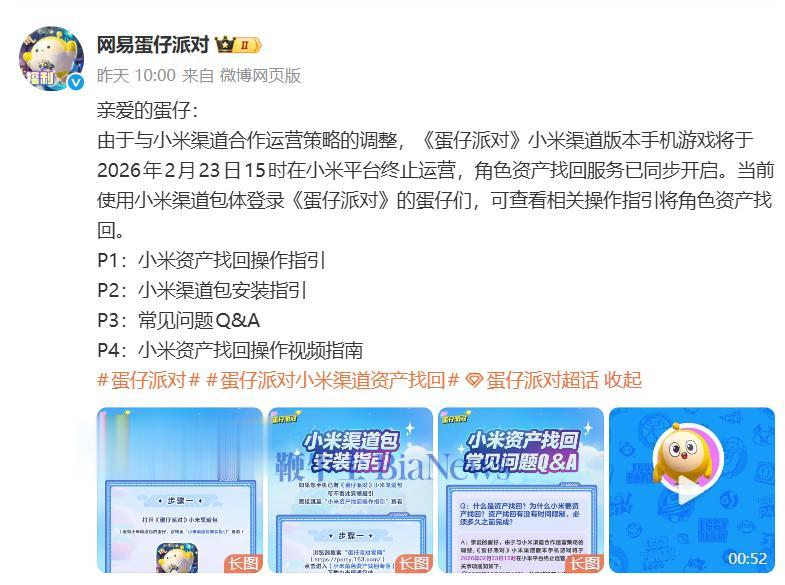 官方表示,由于与小米渠道合作运营策略的调整,《蛋仔派对》小米渠道版本手机游戏将于2026年2月23日15时在小米平台终止运营,角色资产找回服务已同步开启。