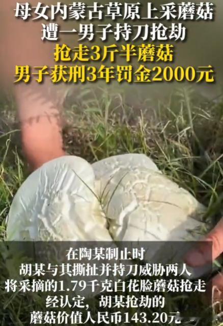 内蒙古呼伦贝尔,牧民陶某带女儿金某在村附近草场采白花脸蘑菇,这时胡某骑摩托车冲来,抢她们的蘑菇,陶某阻拦后,胡某掏出折叠刀威胁,陶某为自身和女儿的安全,放弃了蘑菇。胡某抢走1.79公斤蘑菇后逃走,陶某报了警,民警在胡某家将其抓获,还搜出他采的紫花脸蘑菇等物证。案子移送法院后,胡某最终获有期徒刑三年。 (来源:封面新闻) 2025年8月5日下午1点多,呼伦贝尔的鄂温克族自治旗,牧民陶某带着女儿金某在村附近草场采白花脸蘑菇。 突然,胡某骑摩托车冲来抢蘑菇,陶某阻拦,两人撕扯起来,金某吓得直哭,胡某见抢夺不成,竟掏出折叠刀威胁。 陶某怕伤到自己和女儿,只能放弃蘑菇,胡某抢走1.79公斤蘑菇后逃走,随后,陶某报了警。 这片草场,是当地牧民世代放牧、采蘑菇的地方,每年夏秋之交,各类蘑菇都长了出来,成了牧民们增收的重要来源。 陶某和女儿金某这天午后,来到草场采蘑菇,金某虽年纪小,却也干劲十足,跟着母亲穿梭在草丛间,不一会,小篮子里就装了不少白花脸蘑菇。 胡某这人,平日里游手好闲,不务正业,总想着不劳而获,他见陶某母女采了不少蘑菇,心生贪念,骑着摩托车风驰电掣般冲了过来。 到了跟前,胡某二话不说,伸手就去抢陶某篮子里的蘑菇,陶某哪肯轻易让出,这可是自己和女儿辛苦采来的,于是奋力阻拦,两人瞬间扭打在一起。 金某哪见过这阵仗,吓得哇哇大哭,胡某见抢不过,竟从兜里掏出一把折叠刀,开始威胁陶某。 这时,陶某深知要是自己再反抗,这疯子说不定真会做出伤天害理的事,到时候自己和女儿可就危险了。 权衡利弊之下,陶某只能松开了抓着蘑菇的手,眼睁睁看着胡某把1.79公斤蘑菇抢走,然后骑着摩托车走了。 看着胡某远去的背影,陶某赶紧安慰受惊的女儿,随后也报了警。 民警深知,这种持刀抢劫的行为性质恶劣,必须尽快将犯罪嫌疑人绳之以法,还牧民一个安宁。 民警们兵分多路,一边在草场周边进行走访排查,寻找目击证人,一边调取周边道路的监控视频,试图锁定胡某的逃跑路线。 经过侦查,很快掌握了胡某的行踪,原来胡某抢到蘑菇后,直接回了家。 仅仅4个多小时后,民警就出现在了胡某家中。 面对突然出现的民警,胡某顿时慌了神,试图反抗,但在民警的果断处置下,很快就被制服。 民警在胡某家中进行搜查时,还意外发现了他采的紫花脸蘑菇等物证。 这些物证,成了指控胡某犯罪的有力证据。 案件,很快被移送到了法院。 在审理过程中,胡某还称自己只是一时糊涂,希望能从轻处罚自己。 本案中,胡某一开始抢蘑菇,陶某奋力阻拦,两人扭打在一起,后来胡某见抢夺不顺,恼羞成怒,掏出折叠刀威胁陶某,这就属于用胁迫的方法,强行劫取财物了。 根据《刑法》第263条规定:以暴力、胁迫或者其他方法抢劫公私财物的,处三年以上十年以下有期徒刑,并处罚金。 胡某的行为完全符合抢劫罪范畴,所以,应该认定他构成抢劫罪。 您觉得遇到这种抢东西还威胁人的情况,第一时间应该怎么做呢?是反抗还是先保证自身安全后再报警呢? 根据《刑法》第67条第3款规定:犯罪嫌疑人虽不具有前两款规定的自首情节,但是如实供述自己罪行的,可以从轻处罚;因其如实供述自己罪行,避免特别严重后果发生的,可以减轻处罚。 这里说的是“可以”从轻或者减轻处罚,不是“应当”。 也就是说,法院有自由裁量的权力,会根据案件的具体情况来决定是否从轻。 本案中,胡某的犯罪情节恶劣,危害性大,又有前科,所以,最终不会因为他的认罪情节,就盲目从轻处罚。 您觉得对于有前科又再次犯罪的人,法律是不是应该更严厉一些呢?您身边有没有类似屡教不改的人呢? 法院认为: 胡某的行为已经构成了抢劫罪,性质十分恶劣。 他不仅持刀抢劫,还当着孩子的面威胁两名女性,给受害者造成了极大的心理恐慌,危害性极大。 而且,胡某还有前科,曾因盗窃等违法行为被处理过,这次又犯下抢劫罪,属于屡教不改,主观恶性较深。 因此,对于他缓刑和减罚金的主张,不予采纳。 最终,法院以胡某犯抢劫罪,判处有期徒刑3年,并处罚金2000元。 在生活中,一定要遵守法律法规,不要心存侥幸,妄图通过不正当手段获取利益。 否则,一旦触犯法律,必将受到法律的严惩,到时候后悔可就来不及了。