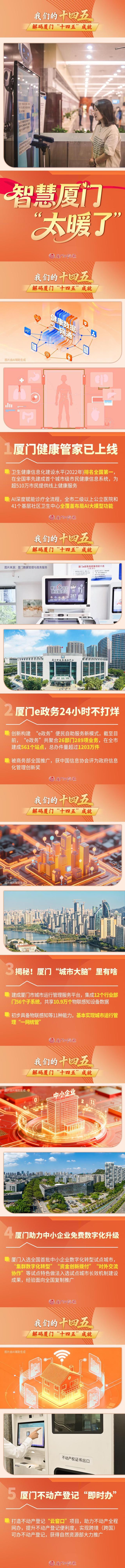从全国首个城市级市民健康信息系统,到“24小时不打烊”的“e政务”便民自助服务新模式;从基本实现城市运行管理“一网统管”的“城市大脑”,到助力中小企业数字化升级的试点举措,再到实现“即时办”的不动产登记“云窗口”……五年来,厦门以数字化转型赋能智慧城市建设,让城市更聪明、服务更温暖。一系列创新实践,让“智慧”转化为触手可及的便捷度和发展力,让更智能、更高效、更宜居的“智慧厦门”不断从蓝图变为现实。