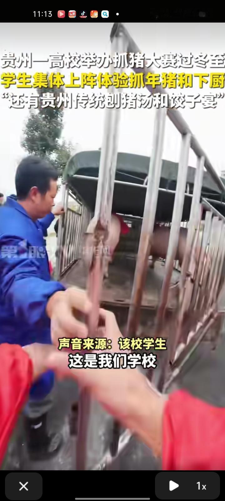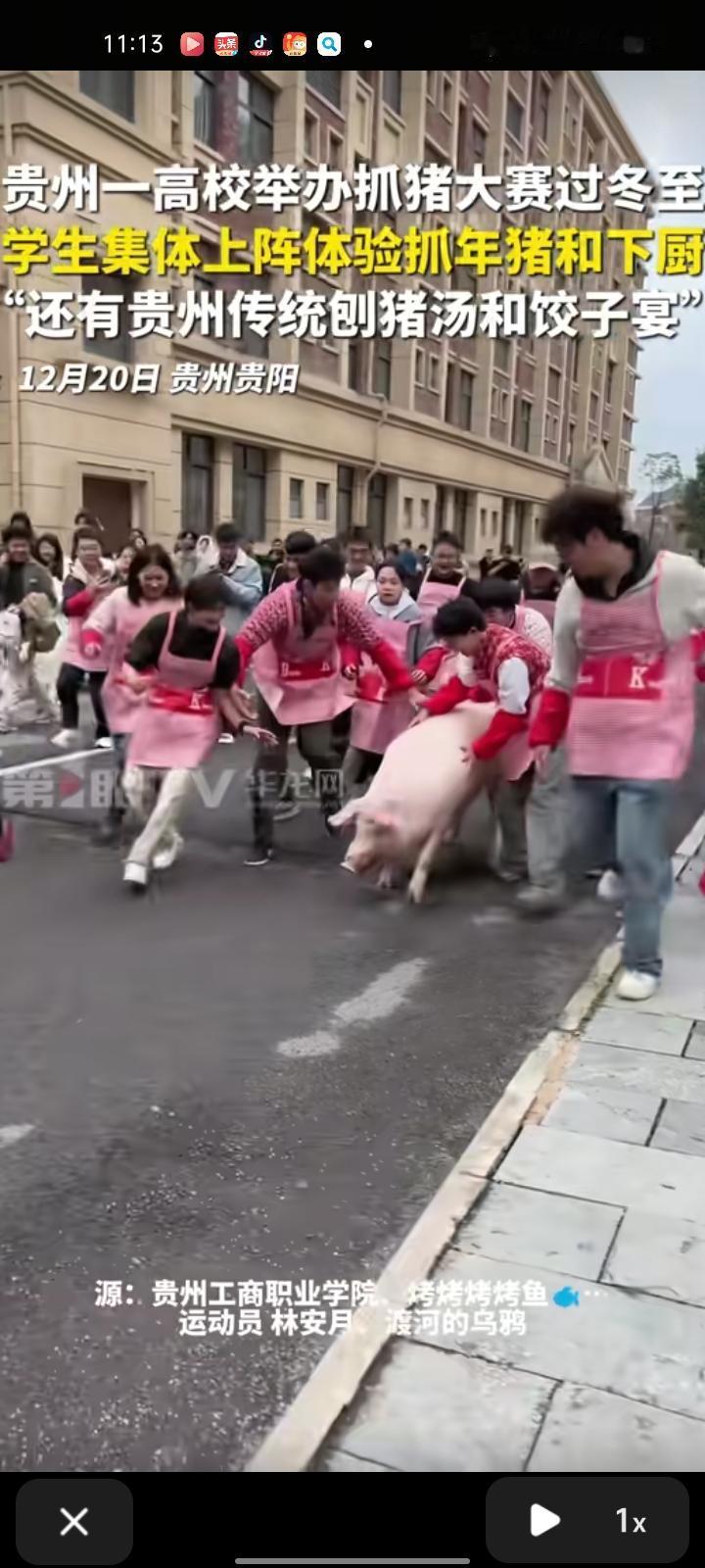 12月20日,贵阳清镇市。贵州工商职业学院举办抓猪大赛过冬至,学生们集体上阵体验抓猪的快乐。除此之外,学校还准备了贵州传统的刨猪汤和饺子宴,大家一起参与进来就很开心。 抓猪比赛