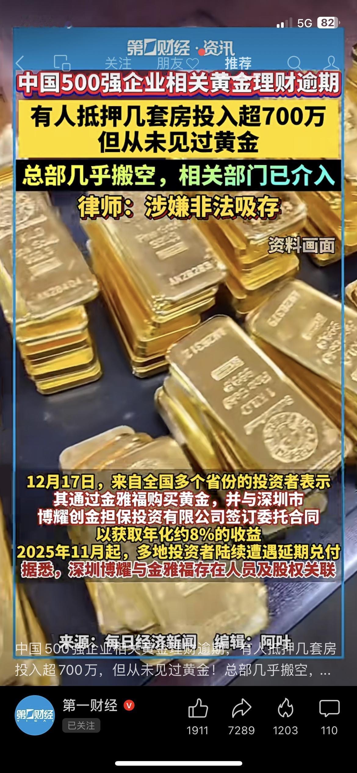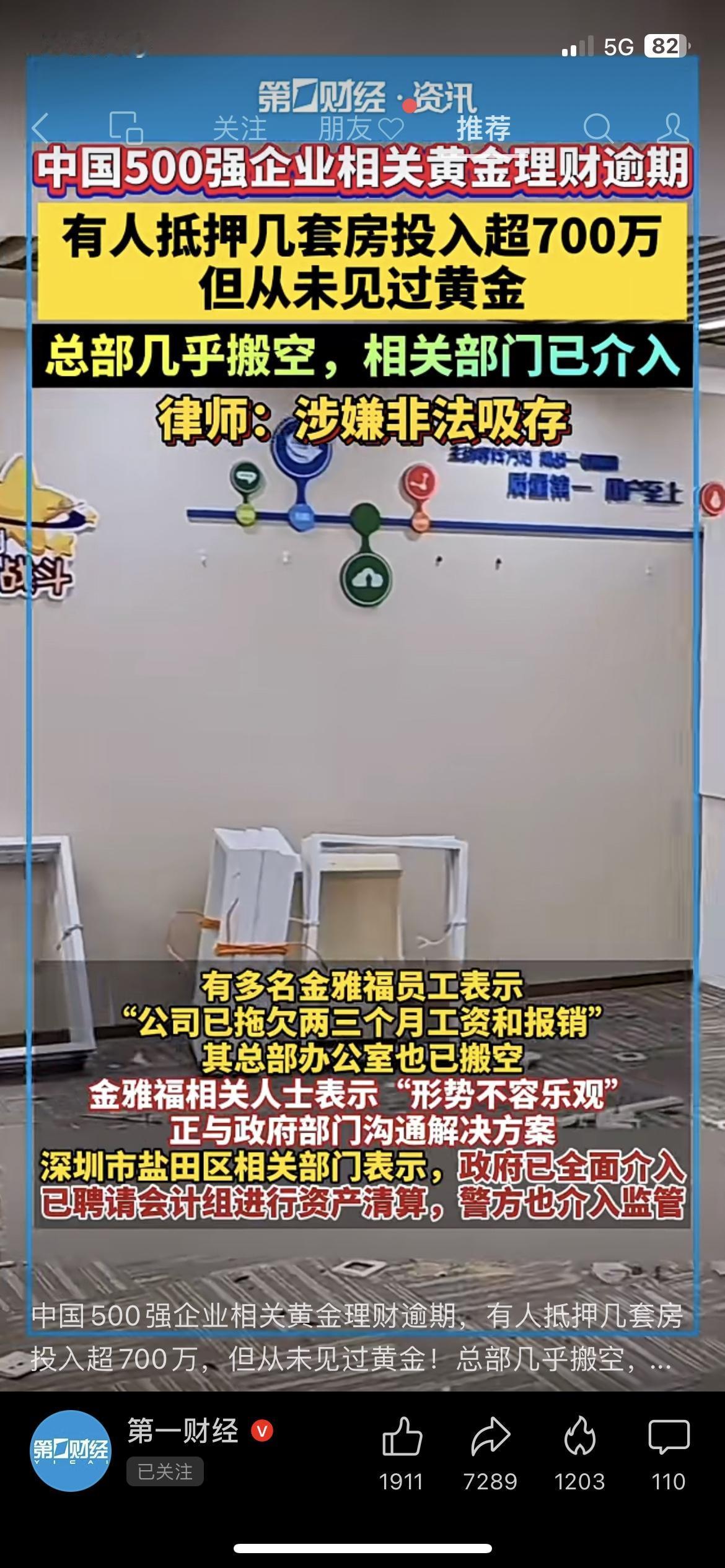 抵押三套房投700万买黄金 结果连金子都没见着! 深圳的魏先生现在悔得肠子都青了 通过金雅福买的黄金理财 11月开始逾期兑付 跑去总部一看 办公室几乎搬空 工资都欠了俩月 相关部门已介入清算 警方也参与监管 金雅福给的方案是展期或转股 投资者根本不买账 有人投了百万 现在每天蹲在盐田区等消息 年底理财坑太多 黄金理财也能翻车 你身边有买过黄金理财的人吗? 理财避雷