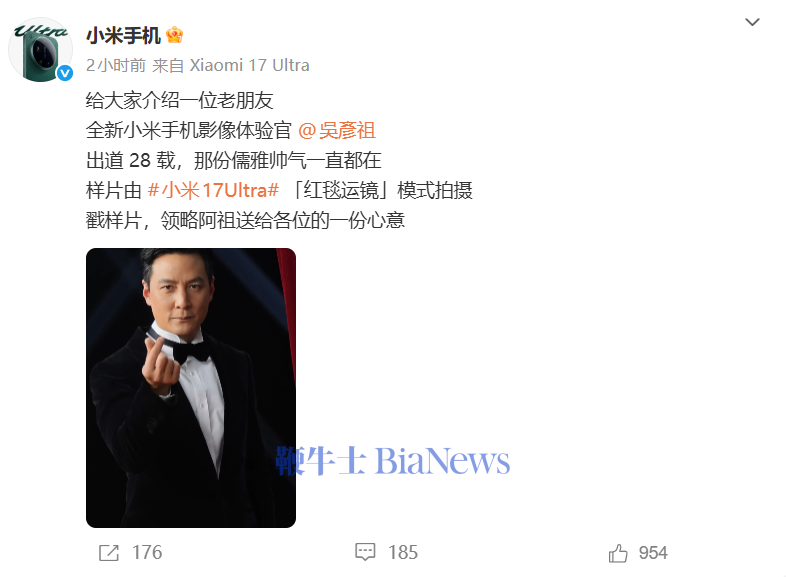 官方放出吴彦祖帅照,并表示,样片由小米17Ultra拍摄。