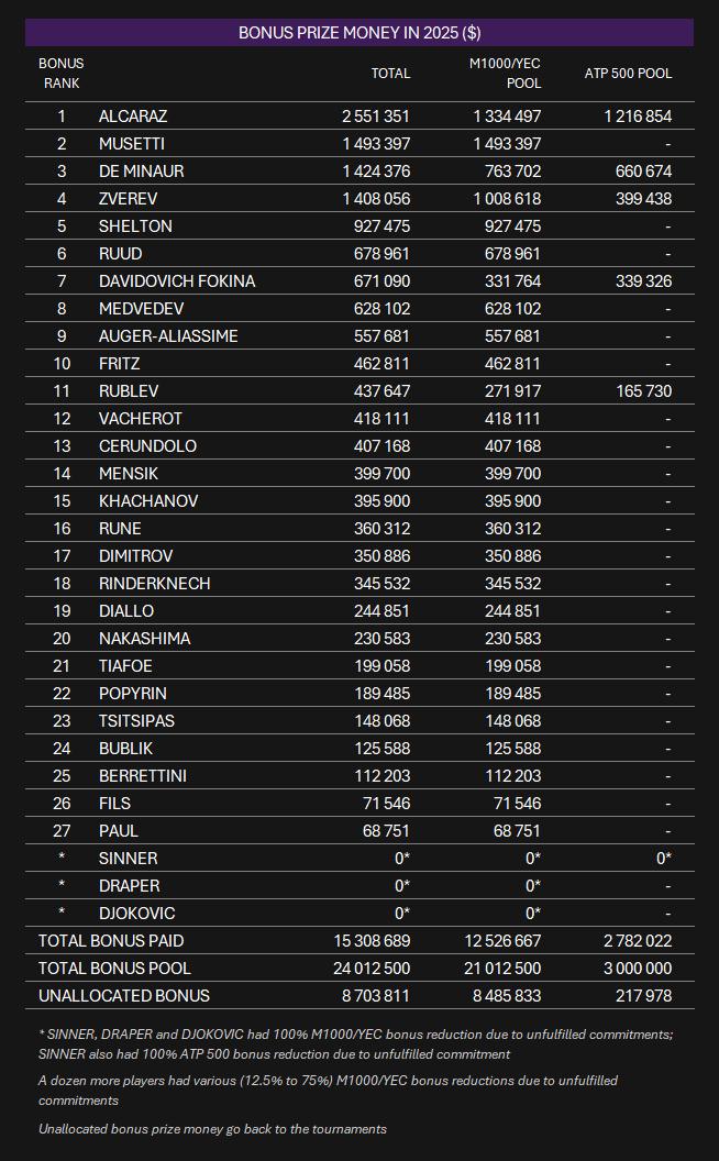 2025atp奖金前30名公布 阿卡排名第一,2135万美元, 辛纳1912万排名第二。 德约科维奇排名第9,达514万美元 前10位: 1,阿卡拉斯 2,辛纳 3,兹维列夫 4,德米纳尔 5,穆塞蒂 6,弗里茨 7,阿里亚西姆 8,谢尔顿 9,德约 10,鲁德