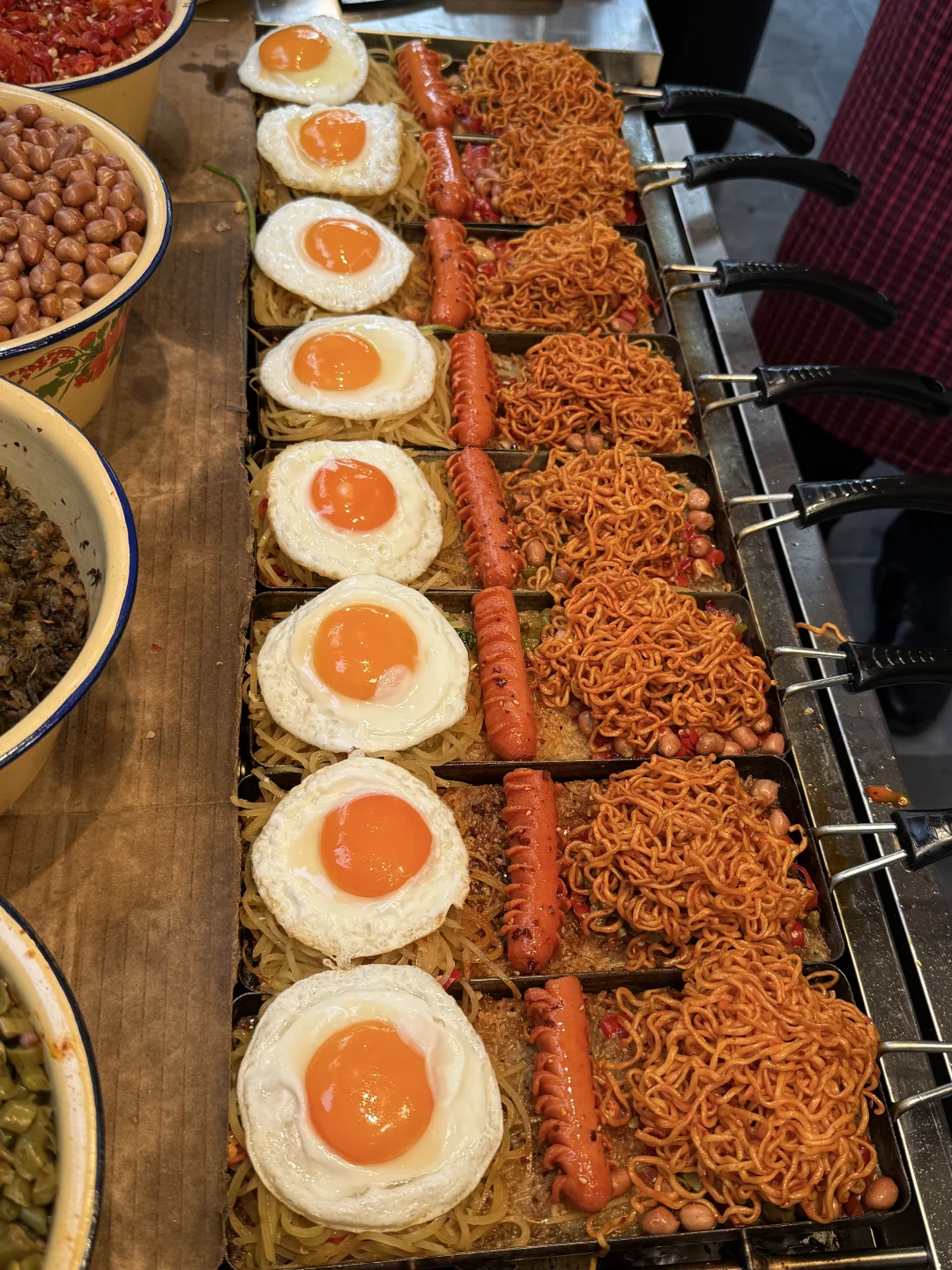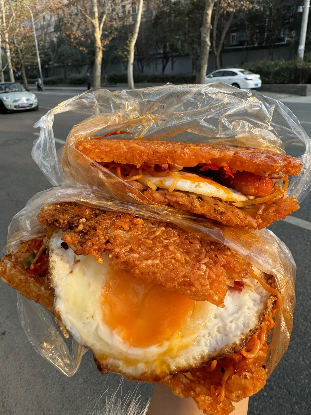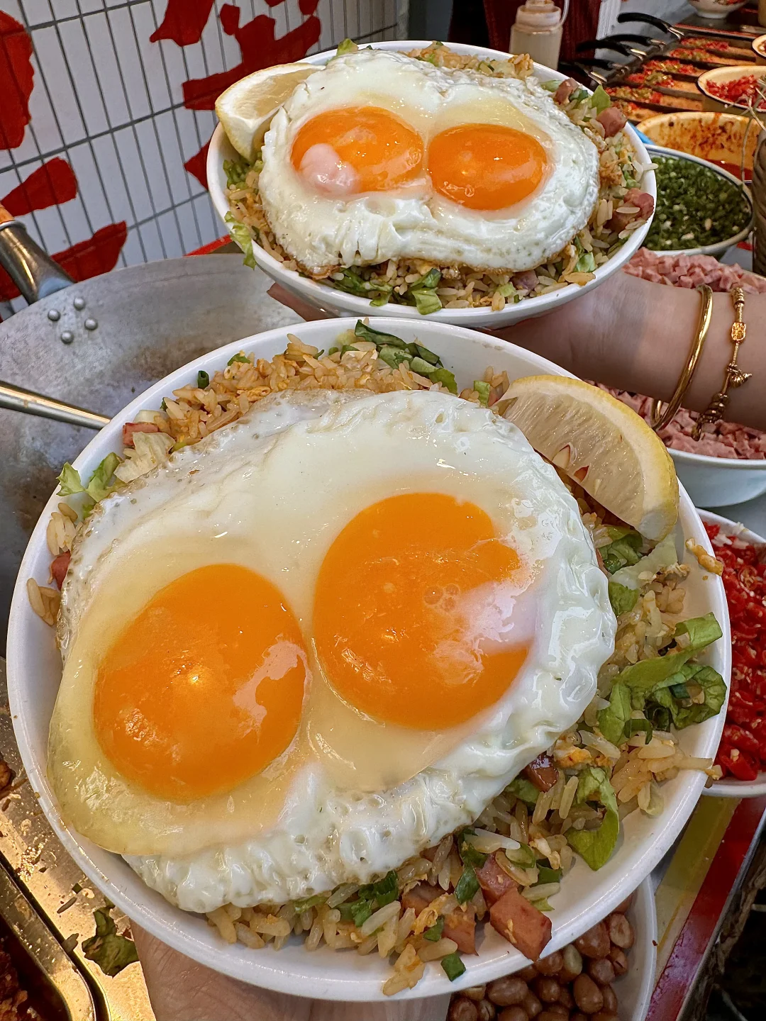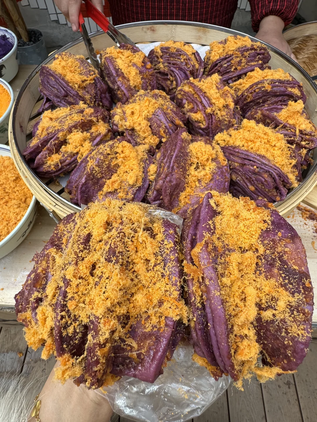 现点现做的紫薯咸蛋黄肉松花卷,双蛋黄流心蛋炒饭,拉丝三角粑,土匪锅巴……