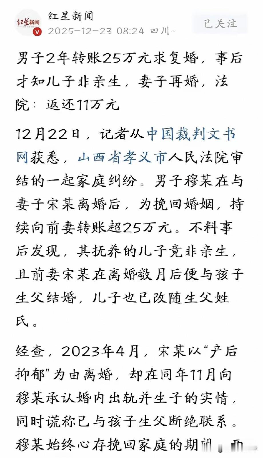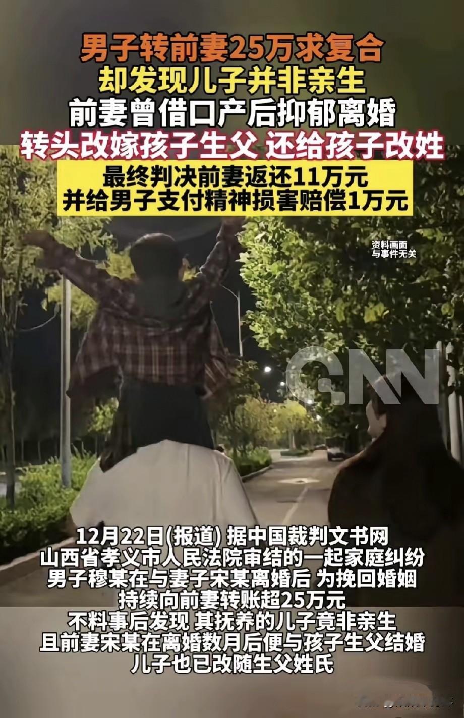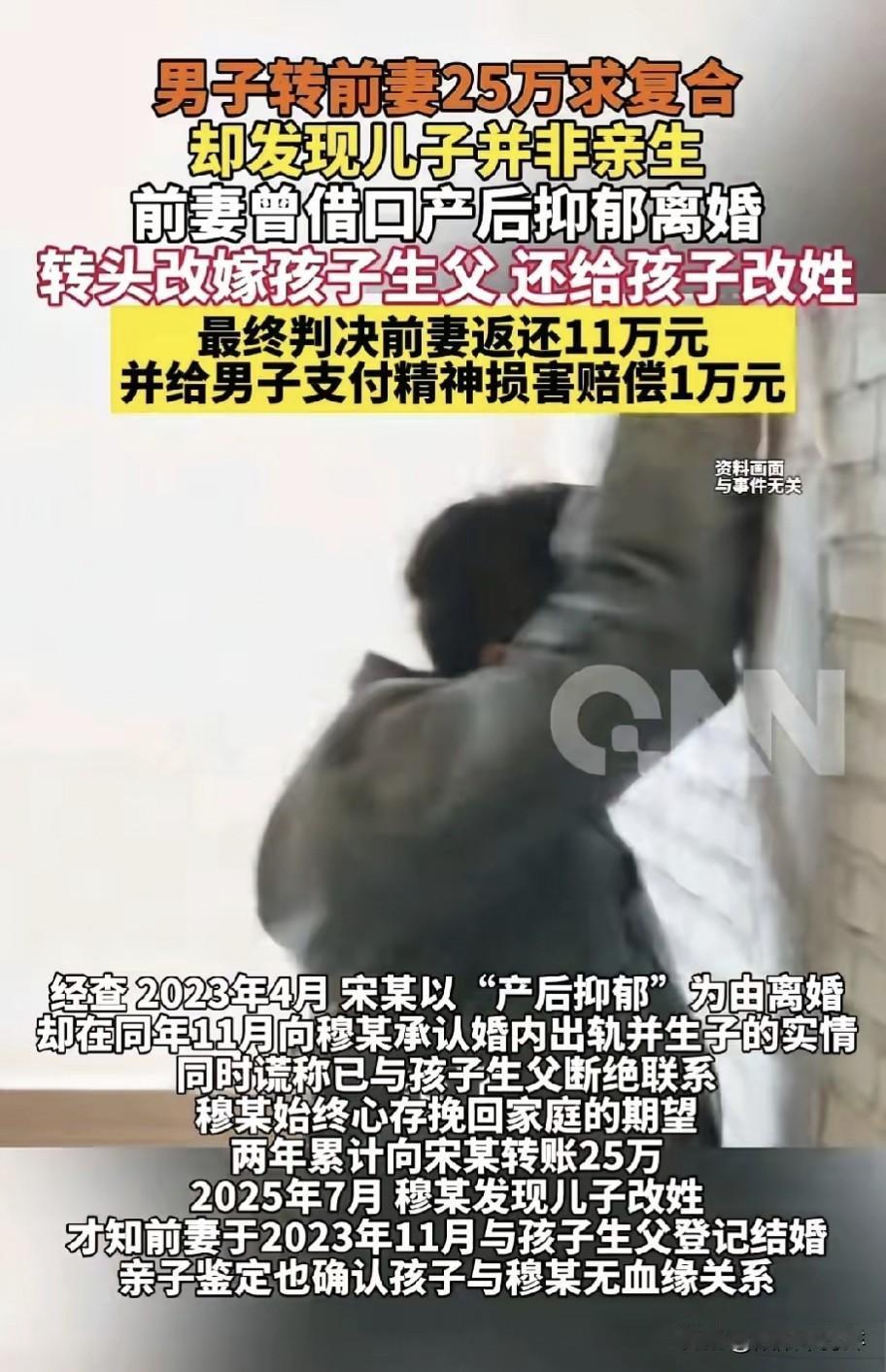 “山西孝义,妻子生下儿子后,以产后抑郁为由,要求离婚,男子无奈只能同意。离婚后,妻子竟然坦白,说儿子不是他亲生的,但已经和孩子生父断了联系。男子懵了,但他不计前嫌,还是希望能和妻子重归于好。为了挽回感情,两年时间里,他给前妻陆续转账25万。可他突然发现,儿子不知何时,竟悄悄改了姓。他赶紧调查,背后的真相让他瞬间暴怒,一气之下闹上法庭。” 山西孝义的穆某,离婚后知道儿子不是自己的,还想着和前妻宋某复合,两年里给她转了25万。结果发现宋某早就跟孩子生父结婚了,连儿子的姓都改了,气得他直接把前妻告上法庭。 这事儿听着就来气。穆某一片真心想挽回,结果被前妻当傻子骗,钱花了不说,感情也被耍了,换谁能不窝火? 现实里,好多人碰到感情事就容易犯糊涂。有人说穆某太傻,明知道孩子不是自己的还瞎花钱;但更多人觉得宋某太缺德,就算离婚也不能这么骗人。就跟那些骗感情骗钱的一样,都是拿别人的真心占便宜,这种人就该被好好治治。 最后法院判了,让宋某还穆某11万,再赔1万精神损失费。钱没全要回来,但总算让骗子付出了代价。 感情里一旦有了欺骗,就没啥信任可言了。不管谈恋爱还是结婚,都得多长个心眼,别让自己的真心白给了。你要是遇到这种事,会怎么处理?